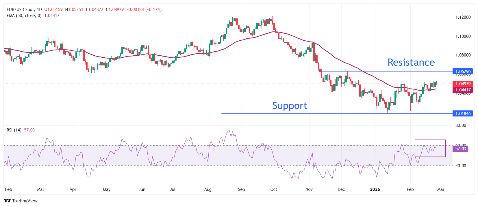 周三,欧元/美元在1.0500附近保持窄幅震盪。50日指数移动平均缐(EMA)继续在1.0440附近支撑主要货币对。