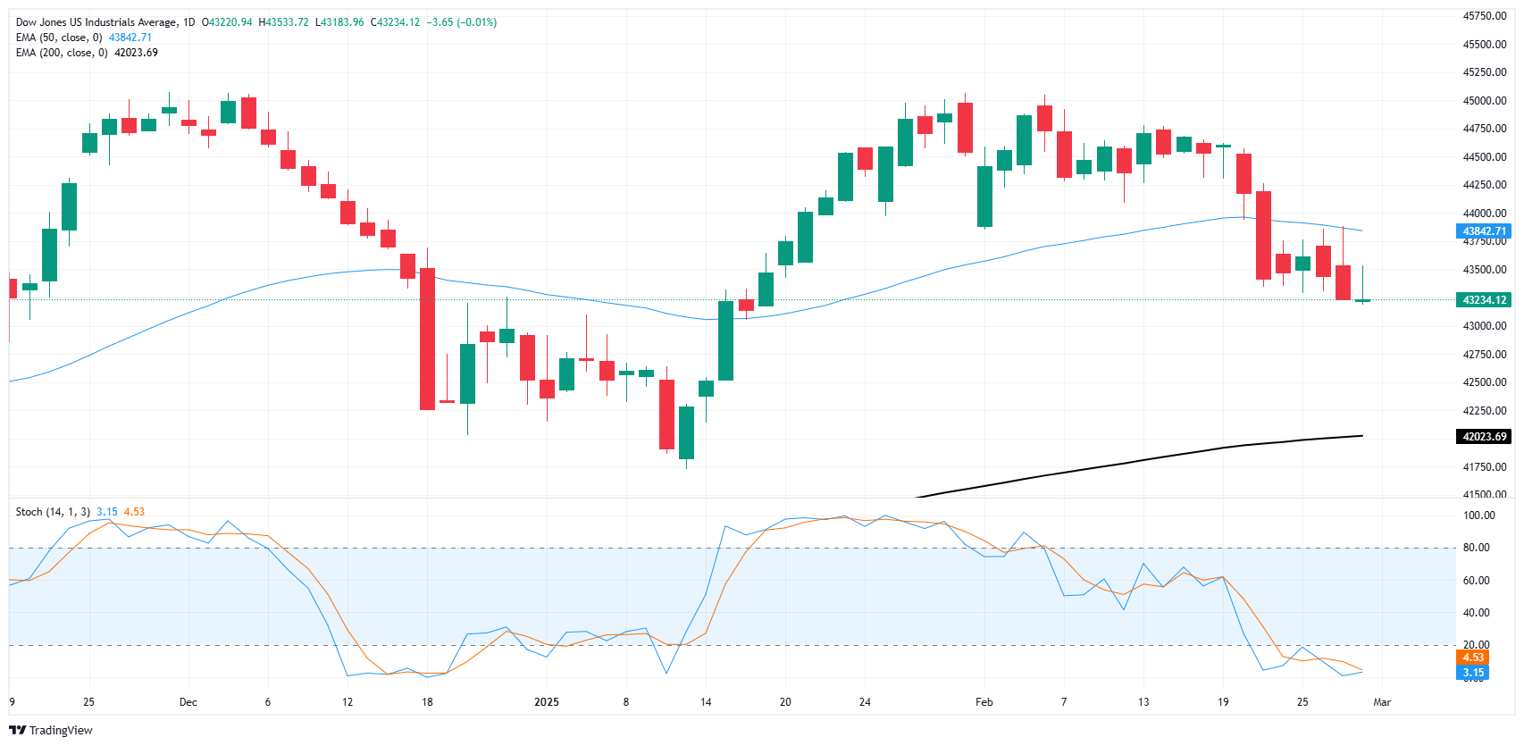 道琼斯工业平均指数(DJIA)周五恢复了一些失去的地面,反弹约150点,继续与43400水平竞争。侭管周五的看涨尝试,但主要股指仍低于周一的𫔭盘价格。美国总统唐纳德·特朗普与乌克兰总统弗拉基米尔·泽连斯基发生争执,因為乌克兰领导人拒绝在没有提问或寻求对特朗普所渴望的"稀土交易"内容进行扩展澄清的情况下簽署特朗普的防禦协议。
