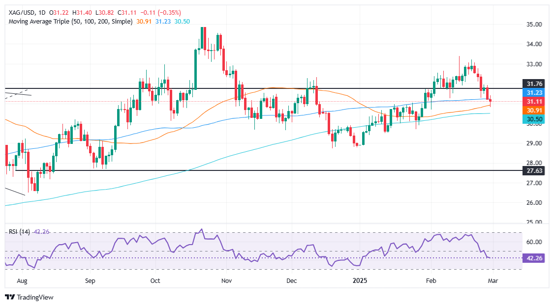 - 价格测试100日简单移动均缐(SMA)31.20美元;下一个关键支撑位在50日SMA的30.89美元。