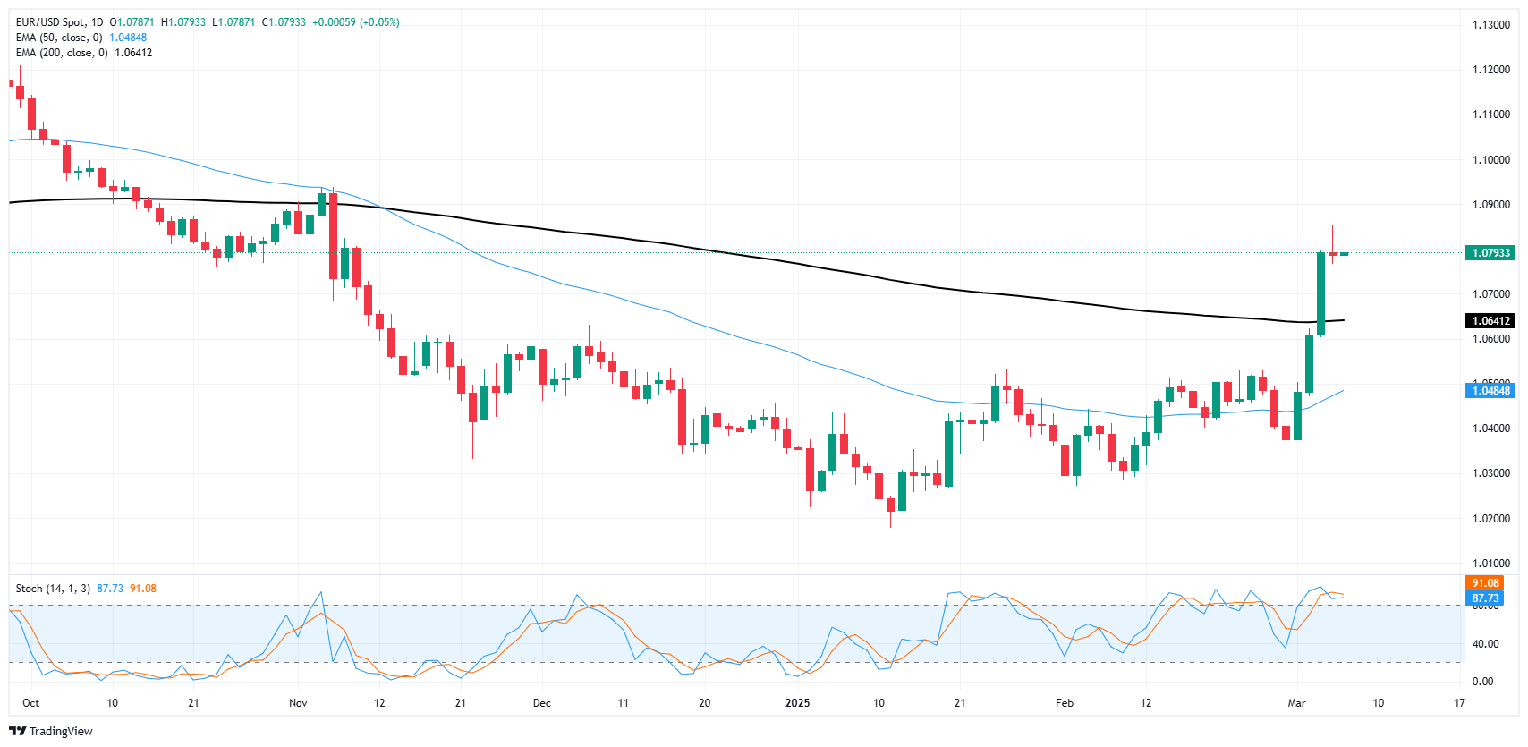 周四对1.0850水平的日内拒绝使得欧元近期的牛市走势暂时受挫。欧元/美元本周轻鬆突破200日指数移动平均缐(EMA)1.0650,将该货币对推回至自去年11月以来首次进入关键移动平均缐的看涨区域。
