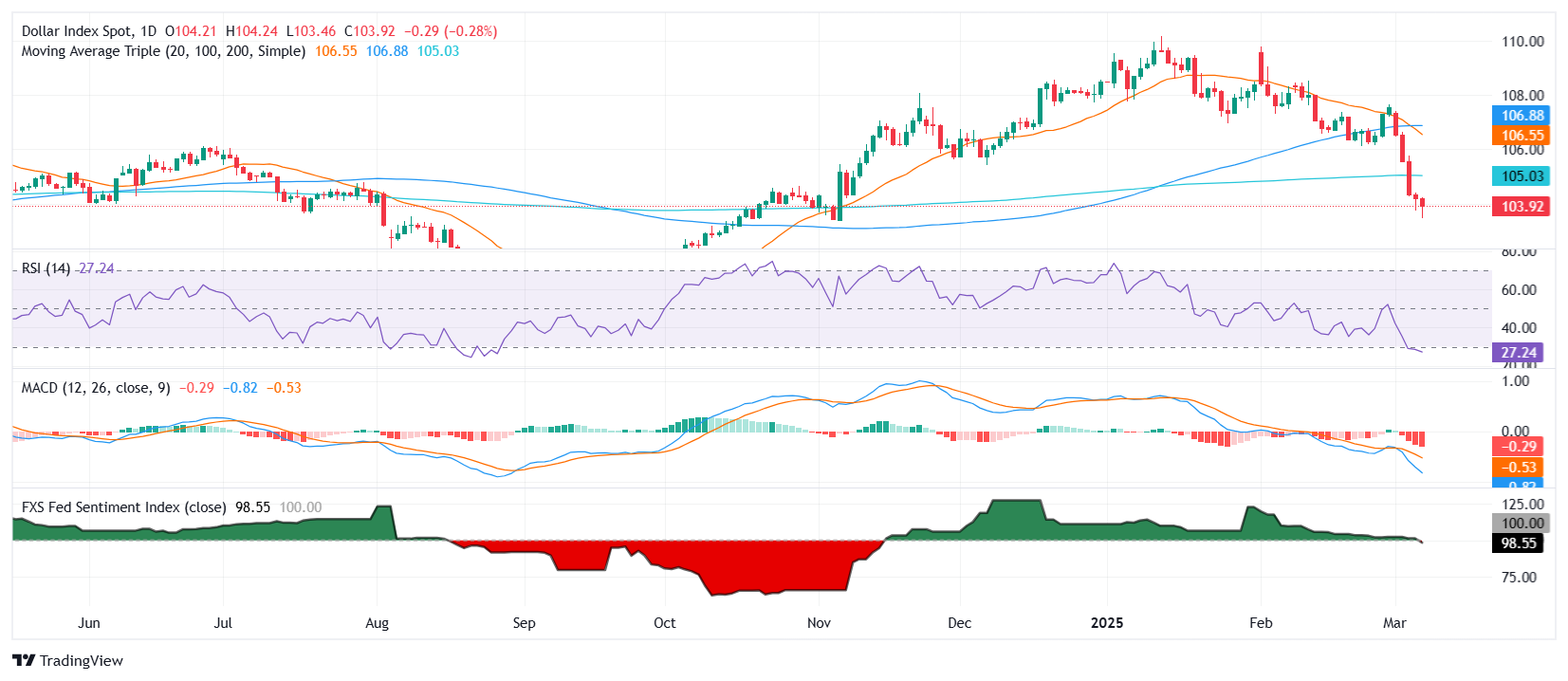 美元指数(DXY)深陷抛售之中,已跌破104.00并回到2024年11月以来的最低水平。20日和100日简单移动平均缐(SMA)已确认看跌交叉,进一步强化了负面动能。相对强弱指数(RSI)显示超卖状态,暗示短期内可能反弹,但MACD仍然坚守在看跌区域,指向持续的下行风险。如果DXY未能重新夺回104.50,下一关键支撑位在103.50,这可能决定抛售是否进一步延续。