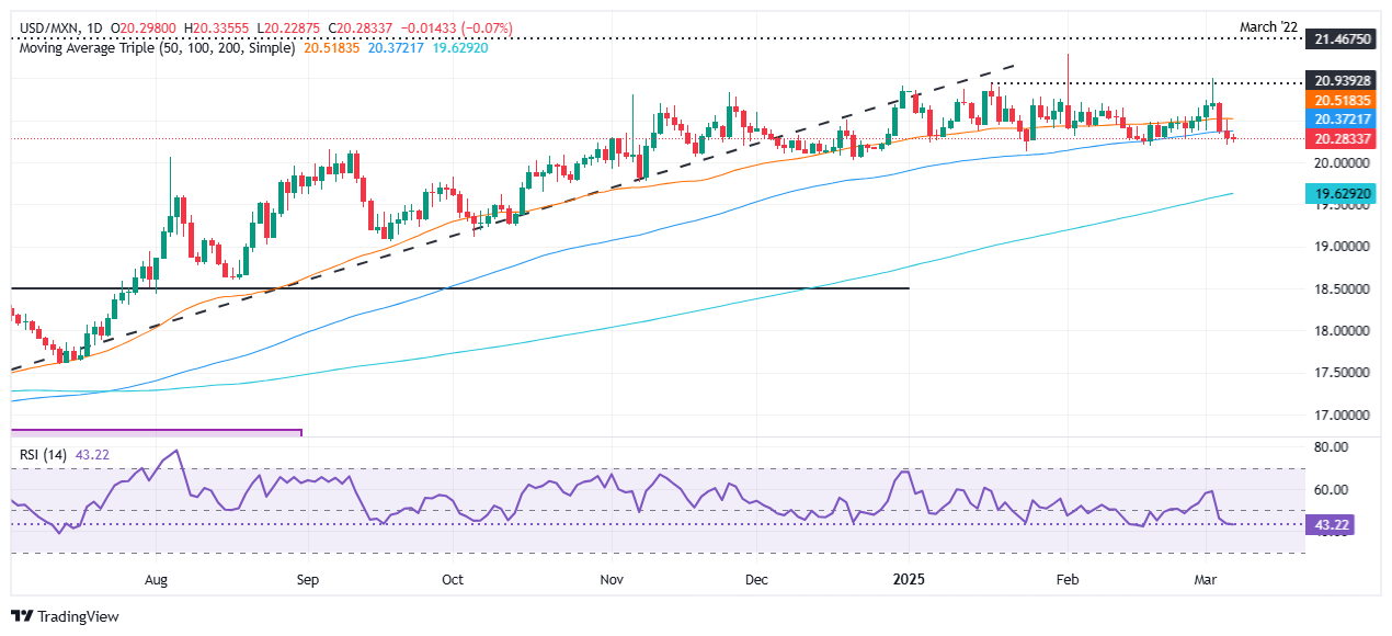 如果美元/墨西哥比索突破100日SMA,下一阻力位将是20.50。如果突破,下一关键阻力位将是3月4日的高点20.99和年内高点21.28。