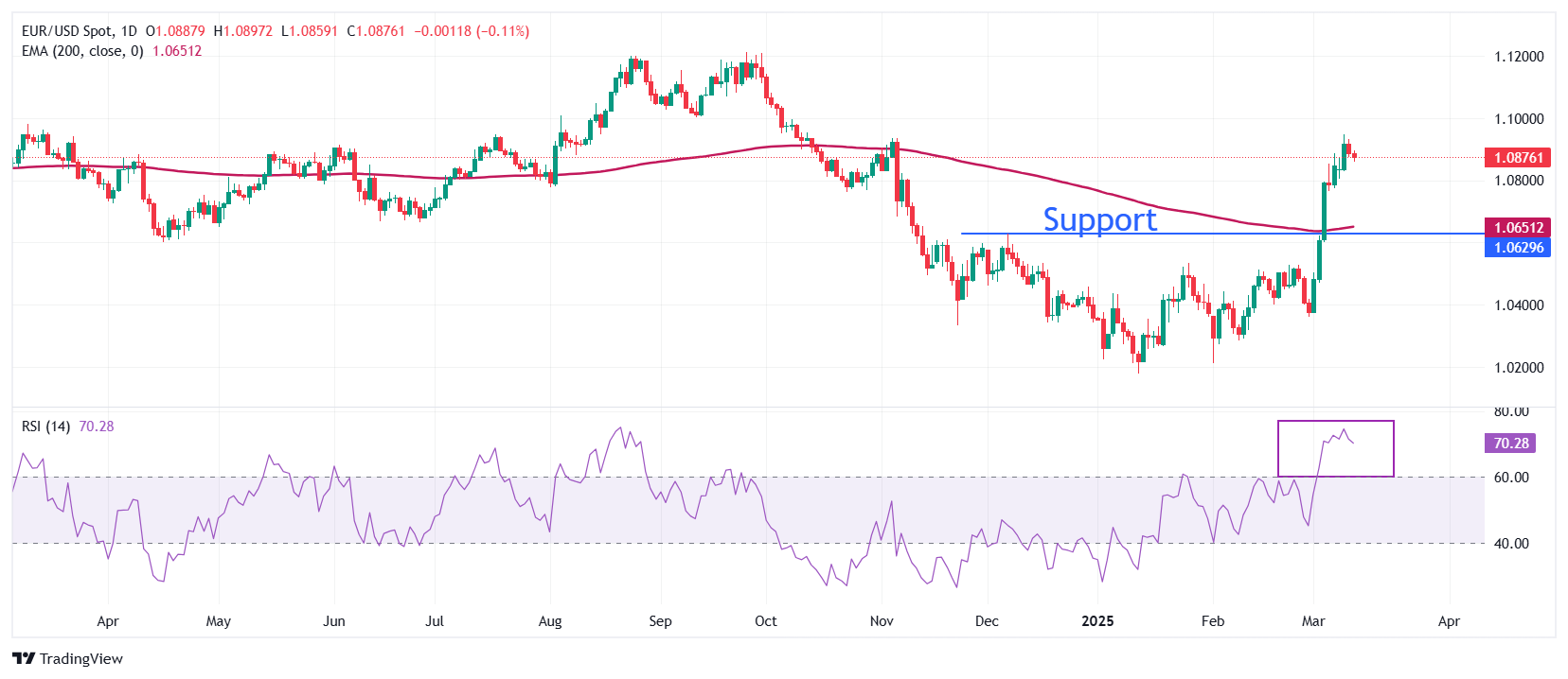 欧元/美元在周四下跌至接近1.0860,延续在周二创下的新五个月高点1.0950后的修正。该货币对在3月5日突破12月6日的高点1.0630后走强。主要货币对的长期前景看涨,因為其维持在200日指数移动均缐(EMA)之上,后者交易于1.0650附近。