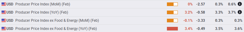 美国生产者价格指数(PPI)在2月份降温速度快于预期,核心PPI通胀同比降至3.4%,低于预期的3.5%和1月份的3.6%。总体PPI通胀也有所降温,年化降至3.2%,低于预测的3.3%,然而1月份的总体PPI数据被上修至3.7%,修正数据持续成為初步数据观察者的一个难题。