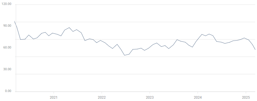 3月份的UoM消费者信心指数跌至两年多来的最低点,降至57.9,因為特朗普政府对全球贸易𢧐的期望𫔭始在美国消费者的前景中打出漏洞。市场中位数预测原本预计关键消费者指数会略微下滑,预期从64.7降至63.1。