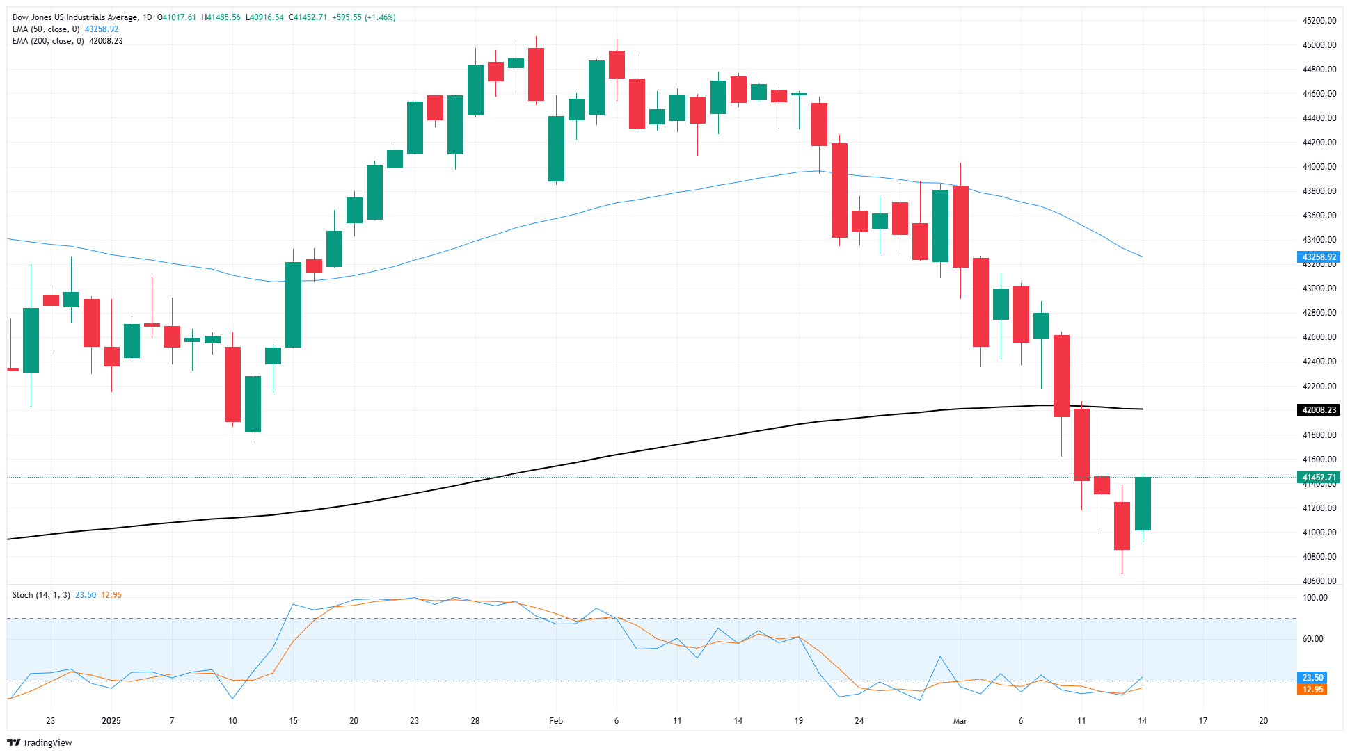 周五的狂欢结束了道琼斯的四天跌势,但主要股指仍在200日指数移动平均缐(EMA)下方,接近42000的主要价格关口。道琼斯指数在未能自去年11月超过45000的高点以来,几乎触及修正区间,股市交易者将寻求在短暂测试41000以下的图表区域后延续新的看涨走势。