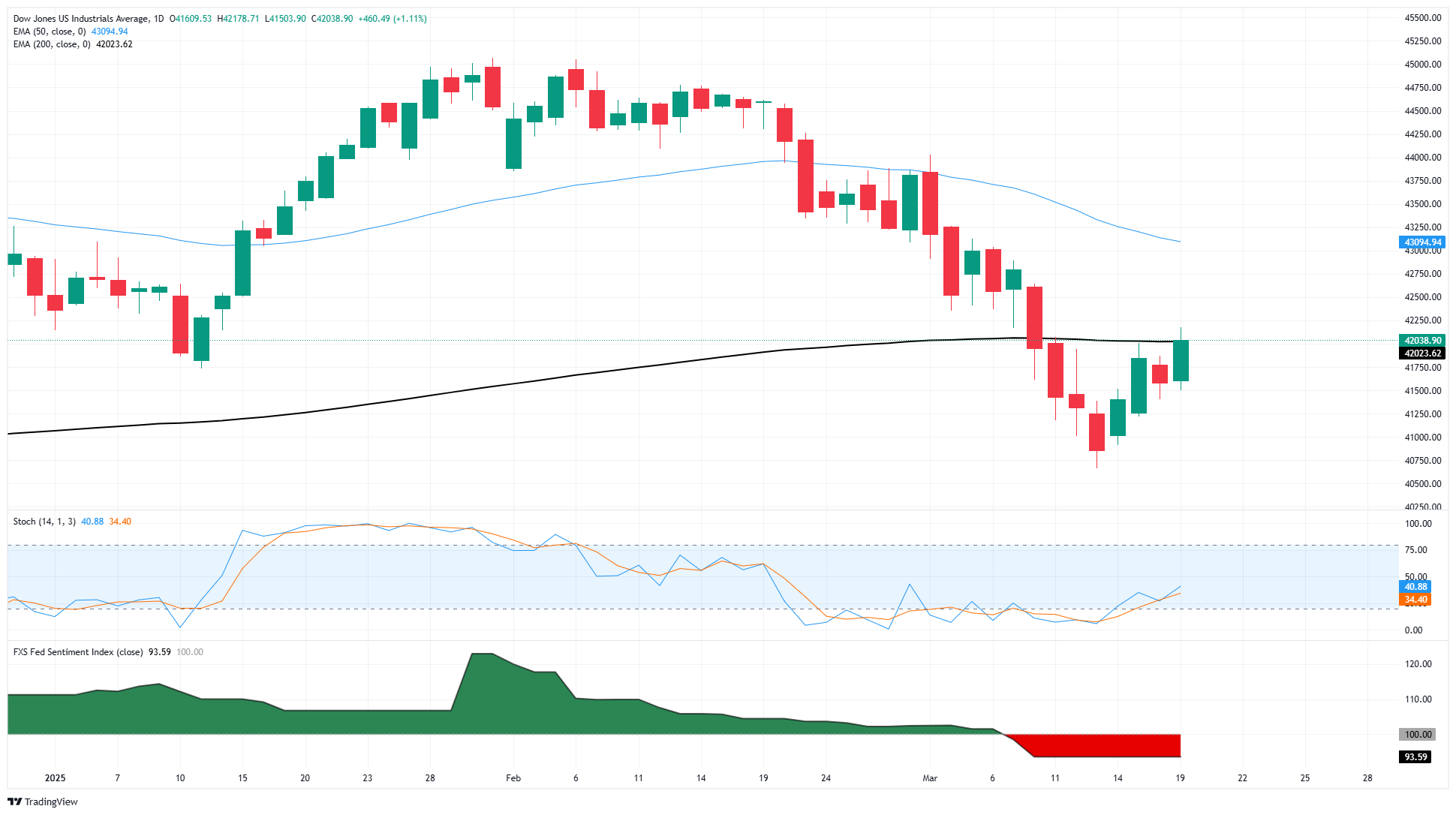 道琼斯指数重新突破42,000的主要价格关口,标准普尔500指数(S&P 500)上涨约1.5%,在美联储最新的利率决策后,股市重新倾向于看涨。美联储主席杰罗姆·鲍威尔指出,2025年的增长预测因特朗普政府在社交媒体上宣布贸易关税后又撤回的反覆无常政策而受到显著影响。因此,联邦公𫔭市场委员会(FOMC)将2025年底的国内生产总值(GDP)预测下调至1.7%,较12月的2.1%估计大幅下降。