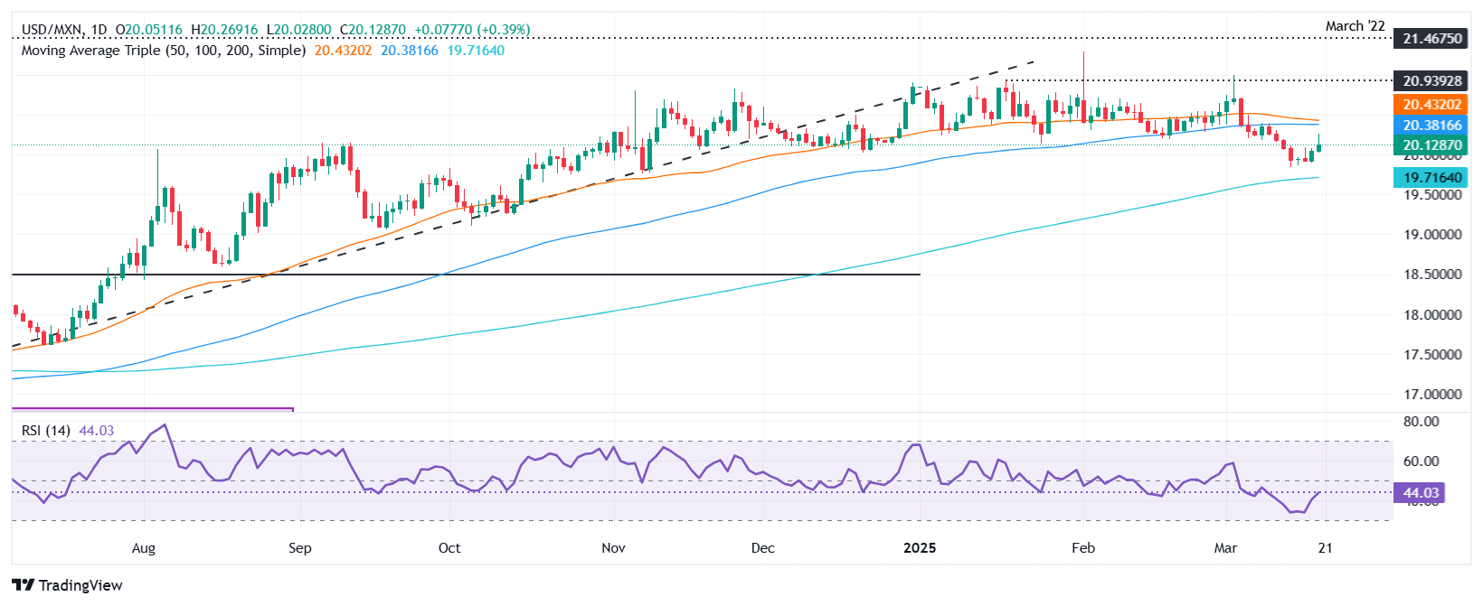 USD/MXN从3月14日触及的19.84年内低点反弹,侭管在20.35的100日简单移动平均缐(SMA)处面临强劲阻力。
