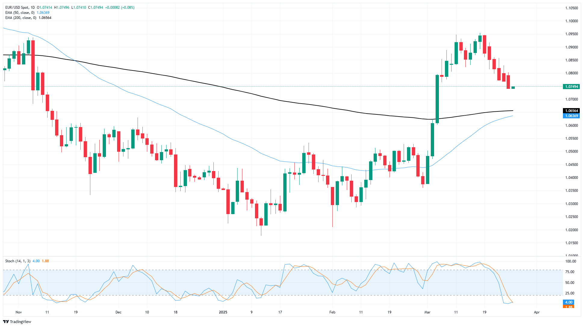 欧元/美元周三加速下行,跌幅超过四分之个百分点,首次滑落至1.0750以下,為三月第一周以来的首次。该货币对已经连续六个交易日失去地面,市场对贸易𢧐的担忧情绪恶化,预计在接近4月2日的日子裡将进一步削弱风险偏好。
