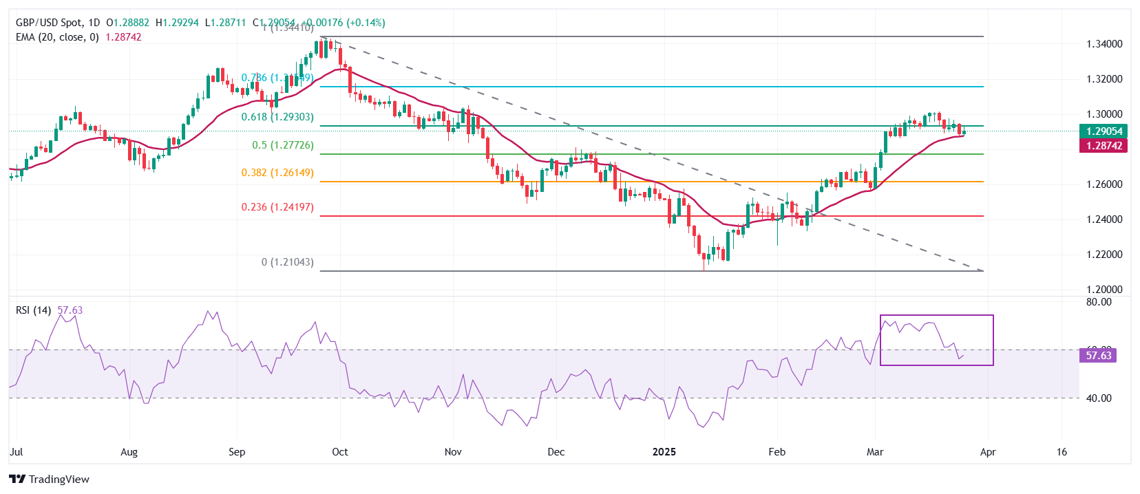 英镑在接近20日指数移动平均缐(EMA)附近找到𧹒盘兴趣后,兑美元反弹,目前交易在1.2873附近。GBP/USD对试图在1.2930附近稳定在61.8%的斐波那契回撤位。