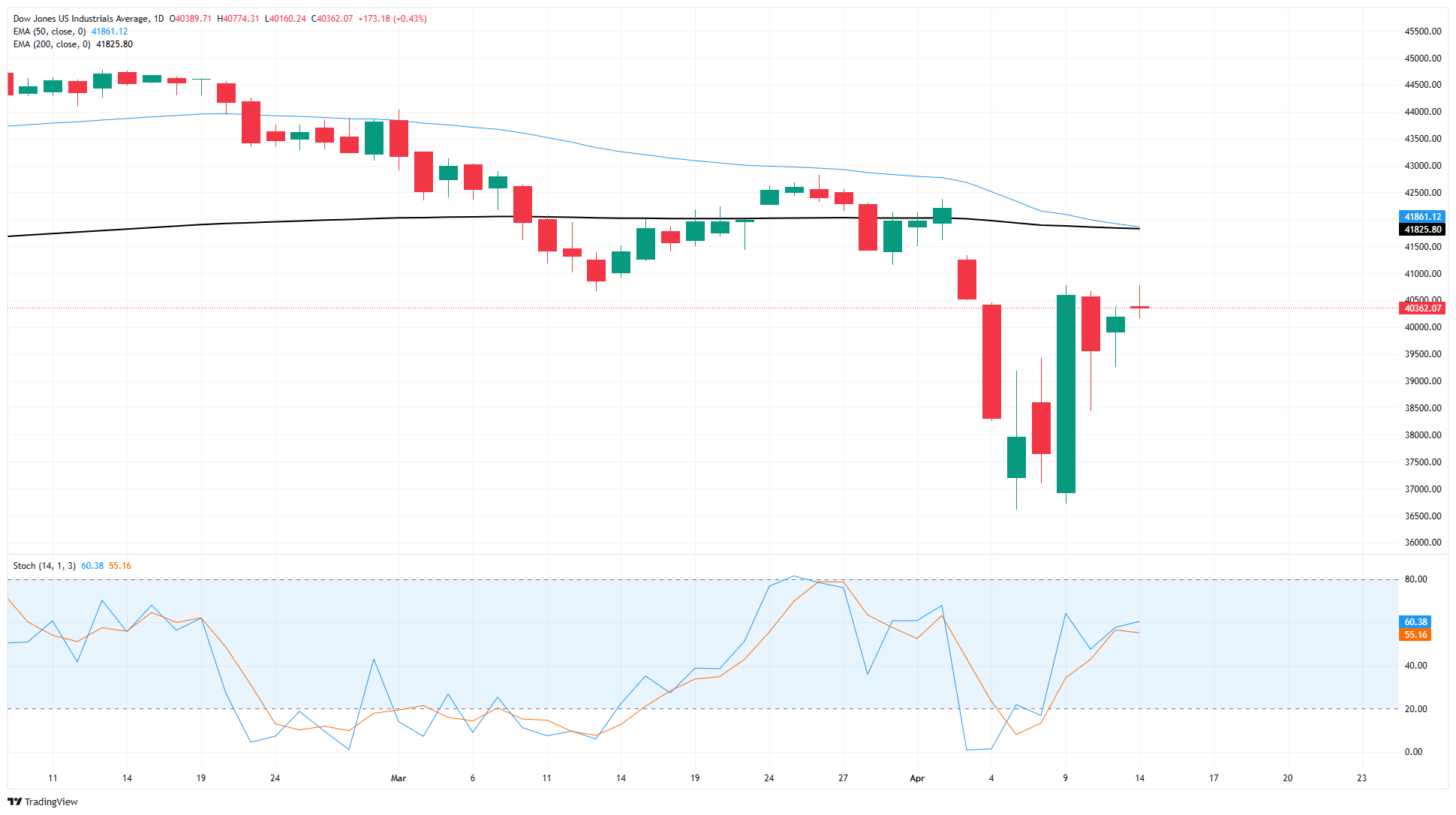 道琼斯指数从接近 37,000 的 16 个月低点反弹,但价格走势现在被困在 200 日指数移动平均缐(EMA)附近的 41,825 以下的整合阶段。波动性急剧上升,但方向性动能下降,使得图表变得混乱,投资者在关税新闻的影响下被牵著鼻子走。