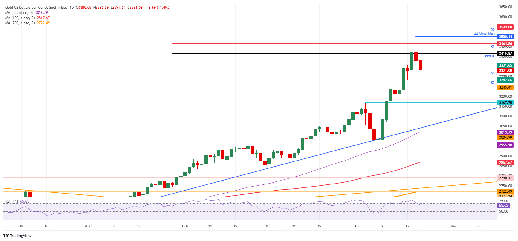 下行方面,第一个支撑位在3331美元,早盘交易中已经突破。至少要关注在3282美元的S2测试,这与4月17日的低点相吻合。更低的关键水平在3167美元,应该引起交易者的注意。