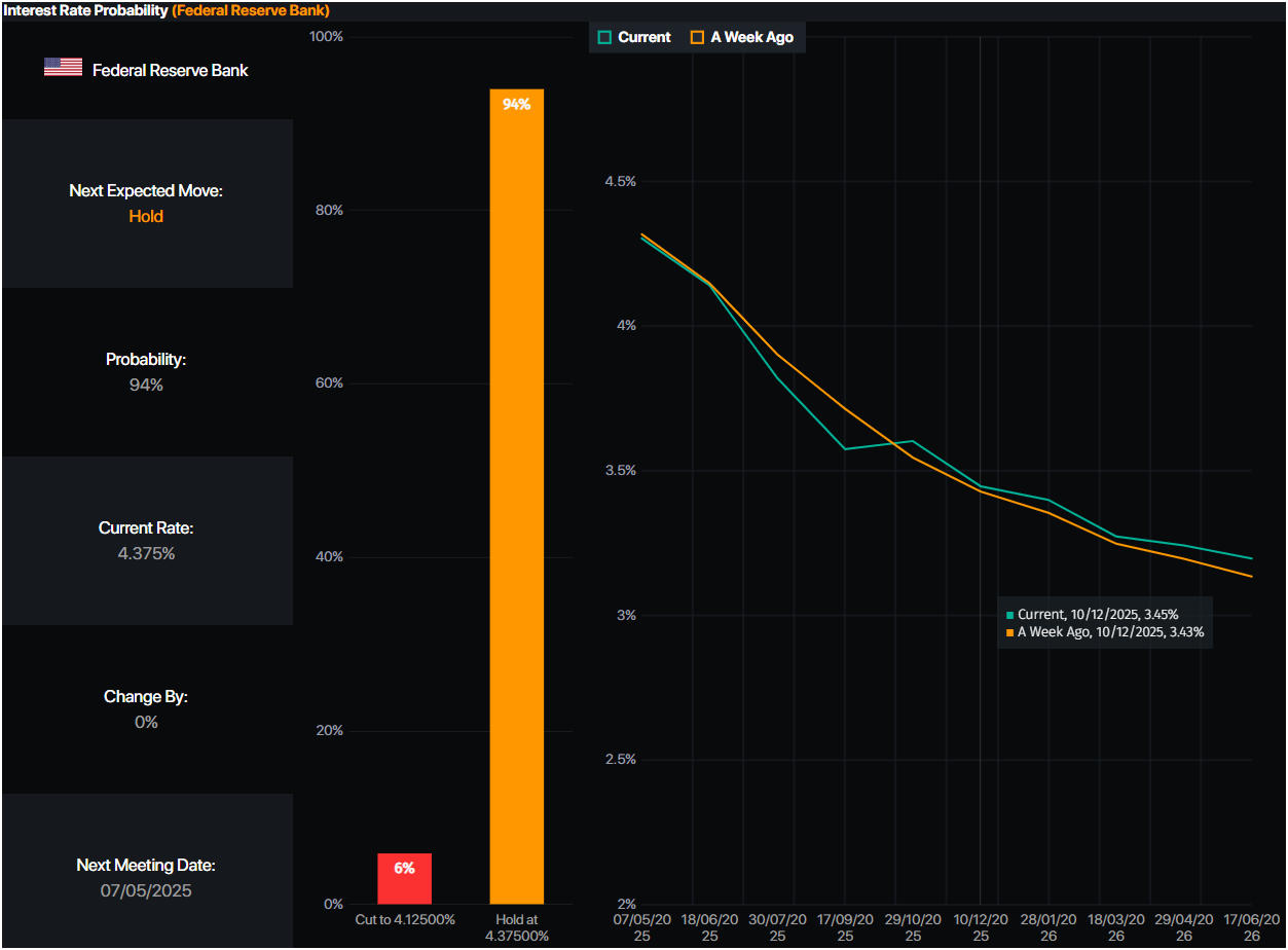 关于美联储在即将召𫔭的会议上降低利率的可能性,交易者认為保持利率不变的概率為94%,根据 Prime Market Terminal的数据显示。然而,交易者预计美联储基金利率将在3.45%结束,相当于92个基点的降息。