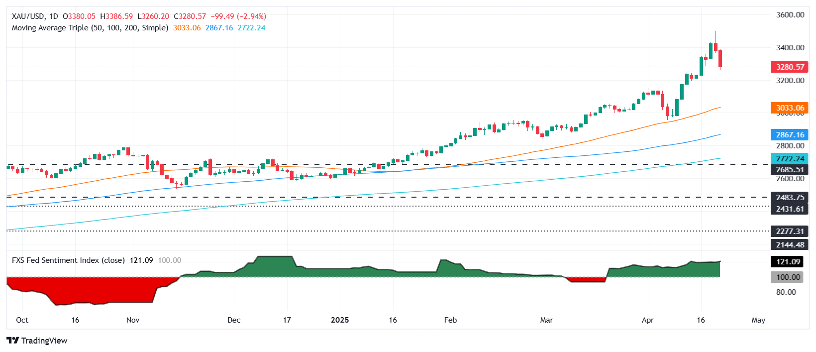 周三,黄金价格因美国与中国紧张局势可能缓解以及美国总统特朗普表示他不打算解雇美联储(Fed)主席杰罗姆-鲍威尔而改善风险偏好,暴跌超过2.50%。截至撰写时,黄金/美元交易于3288美元,之前曾触及日高3386美元。