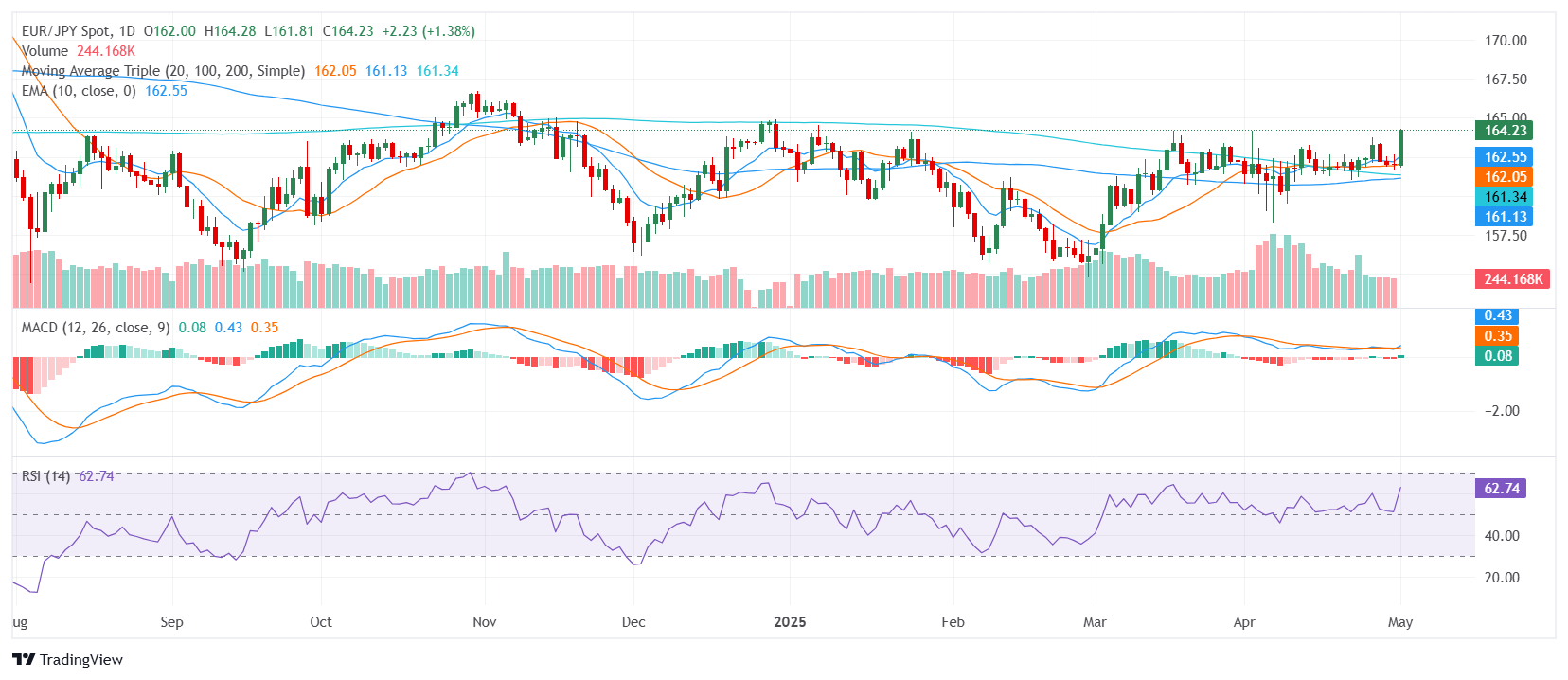 欧元/日元在周四延续了其反弹,推动至164.00区域,此前在欧洲时段强劲上涨。该货币对在进入亚洲时段时接近当天的高点,反映出侭管动能指标趋平,但需求依然强劲。侭管一些短期工具保持中性,但整体技术结构明显看涨,得到了向上趋势平均缐的坚实支撑。