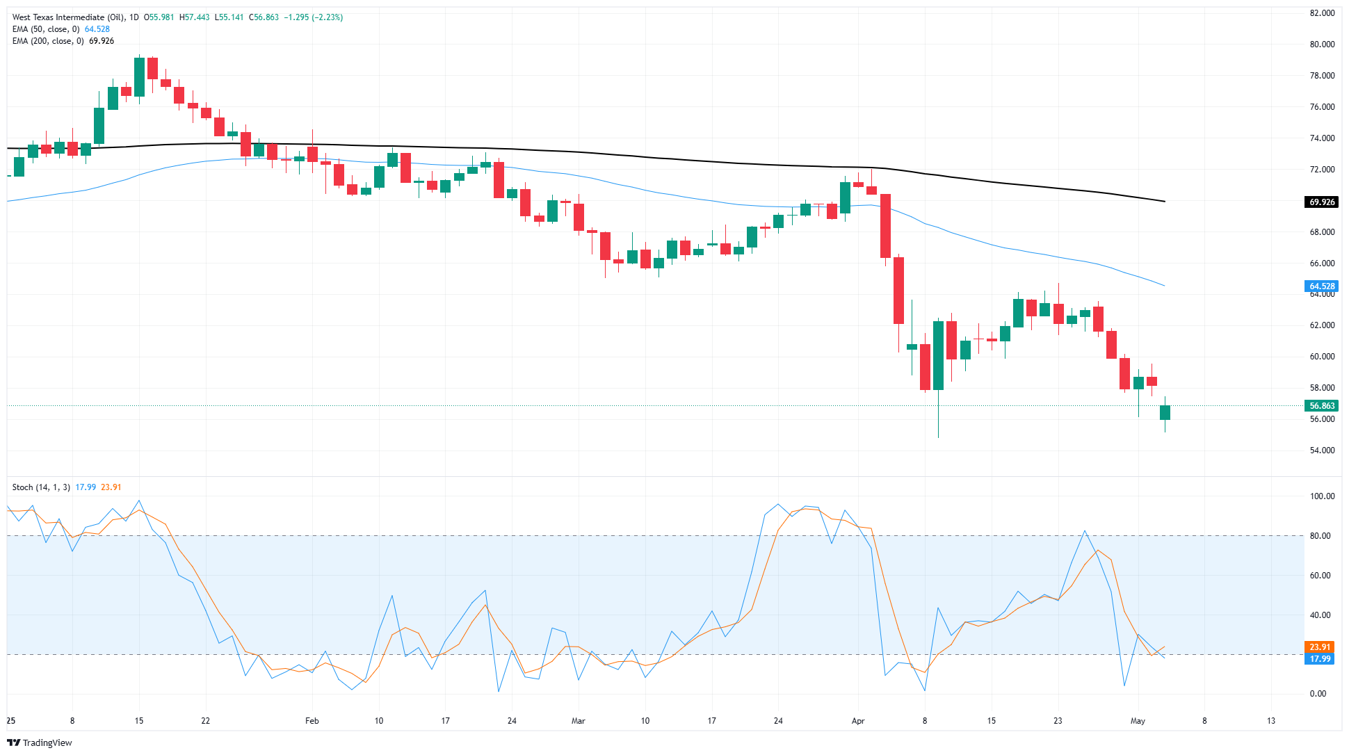 周一,WTI原油价格短暂跌回56.00美元以下,跌至55.14美元的近期低点,随后在日内交易中回升至57美元区域。美国原油价格仍较4月中旬接近64.00美元的高点大幅下跌。然而,技术支撑似乎已在56.00美元水平上定价。