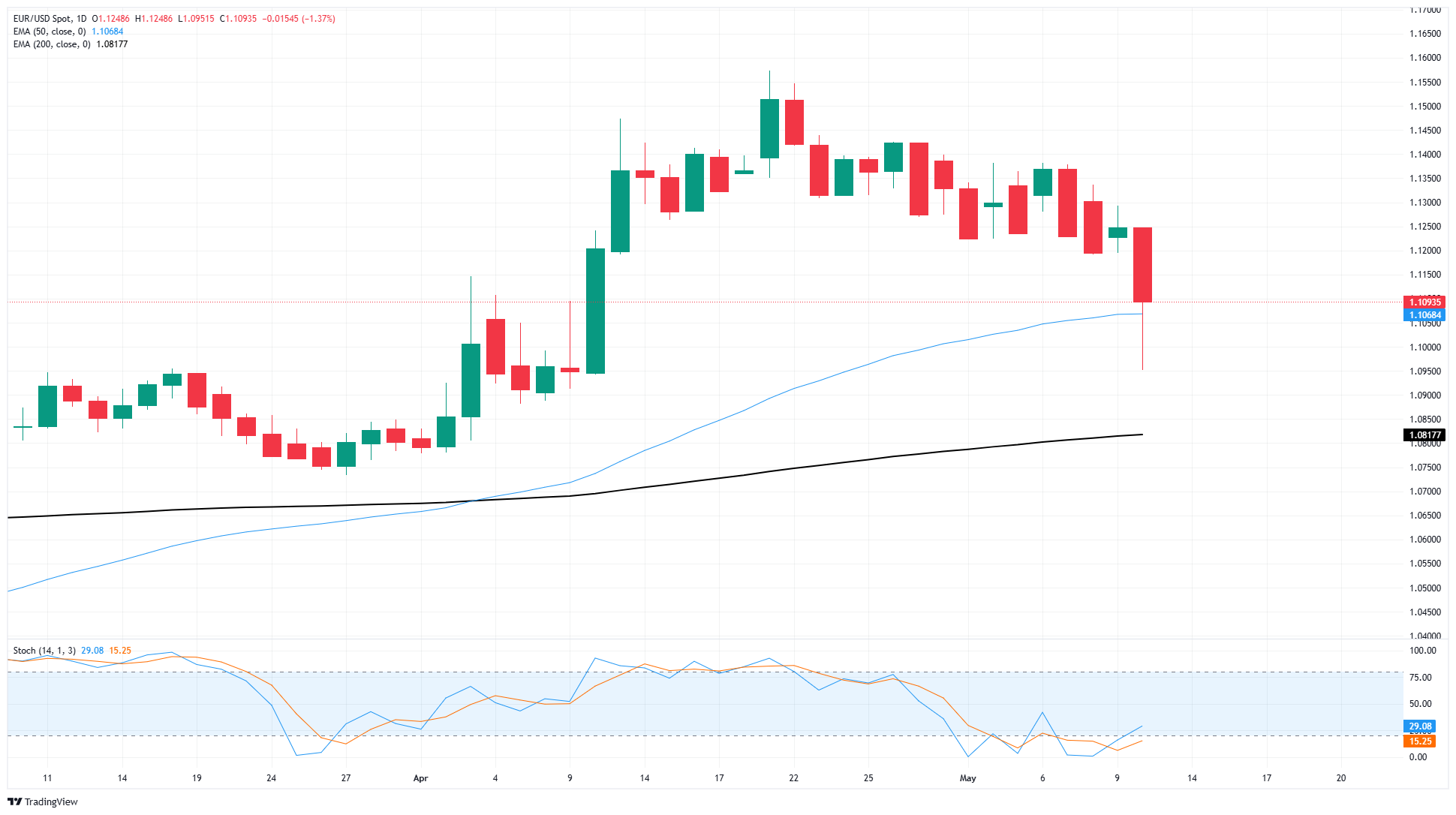 欧元/美元周一的新一轮看跌下跌使该货币对首次测试1.1000以下,这是自4月初以来的首次。该货币对仍在接近1.1070的50日指数移动平均缐(EMA)上方交易,但仅仅是刚刚。