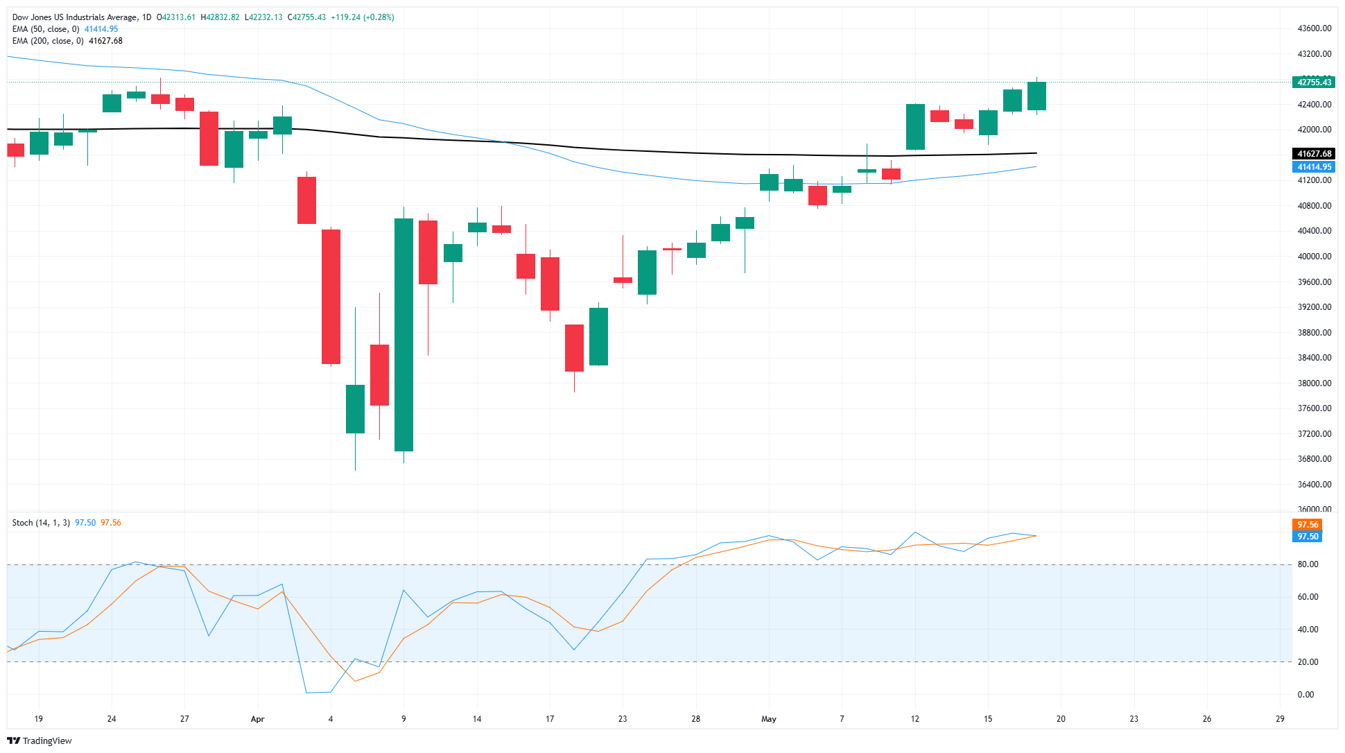 道琼斯工业平均指数继续在图表上攀升。该主要股指连续四周收高,周一𫔭局强劲,已经在迈向第五个看涨周。道琼斯指数进一步突破200日指数移动平均缐(EMA),接近41,500,自4月份因关税暴跌而下滑至36,600以来,已上涨近17%。