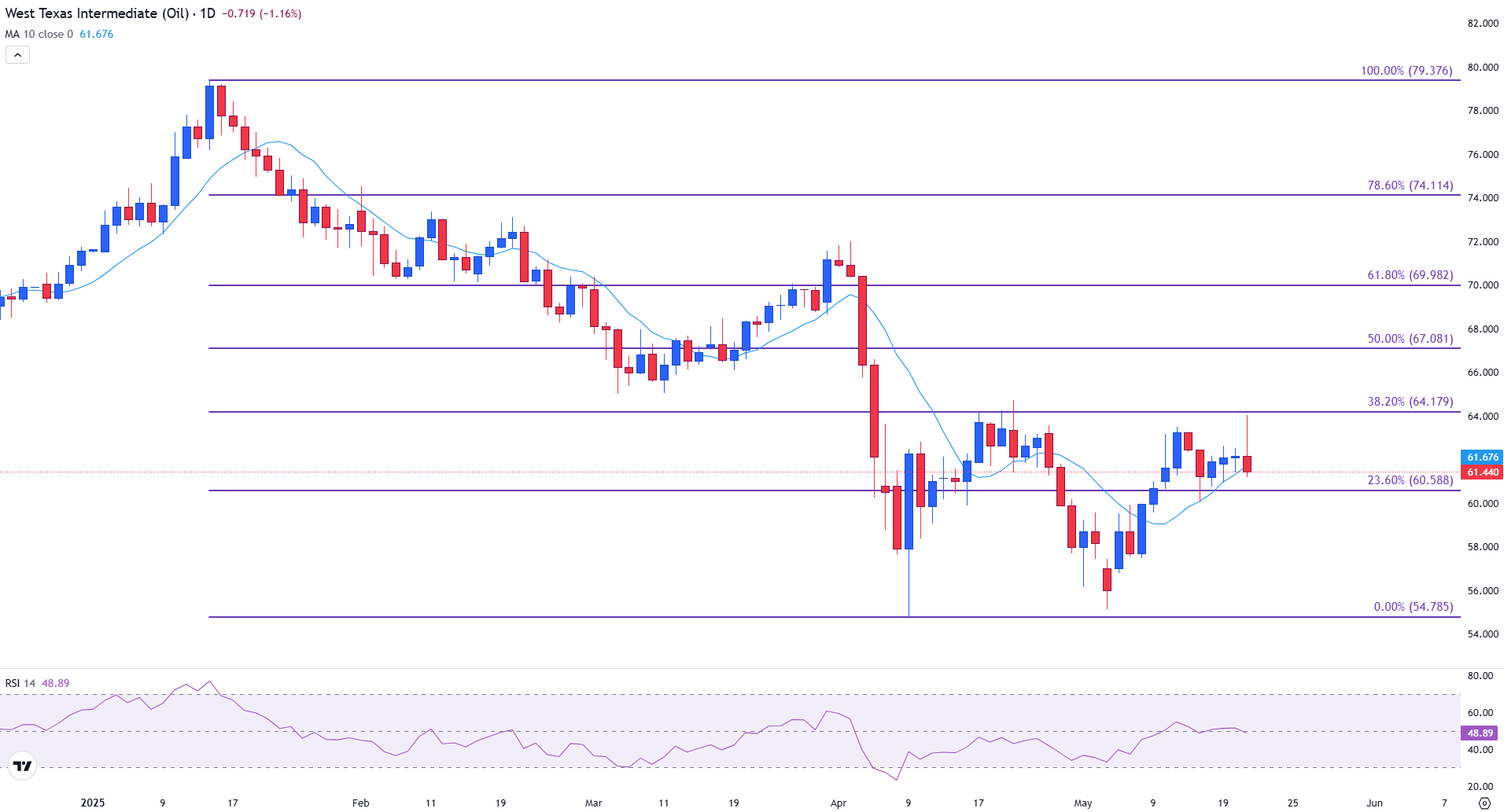 从技术角度来看,WTI 原油最近试图突破 38.2% 的斐波那契回撤位(64.179 美元),该水平对应于 1 月至 4 月的年初至今的下跌。