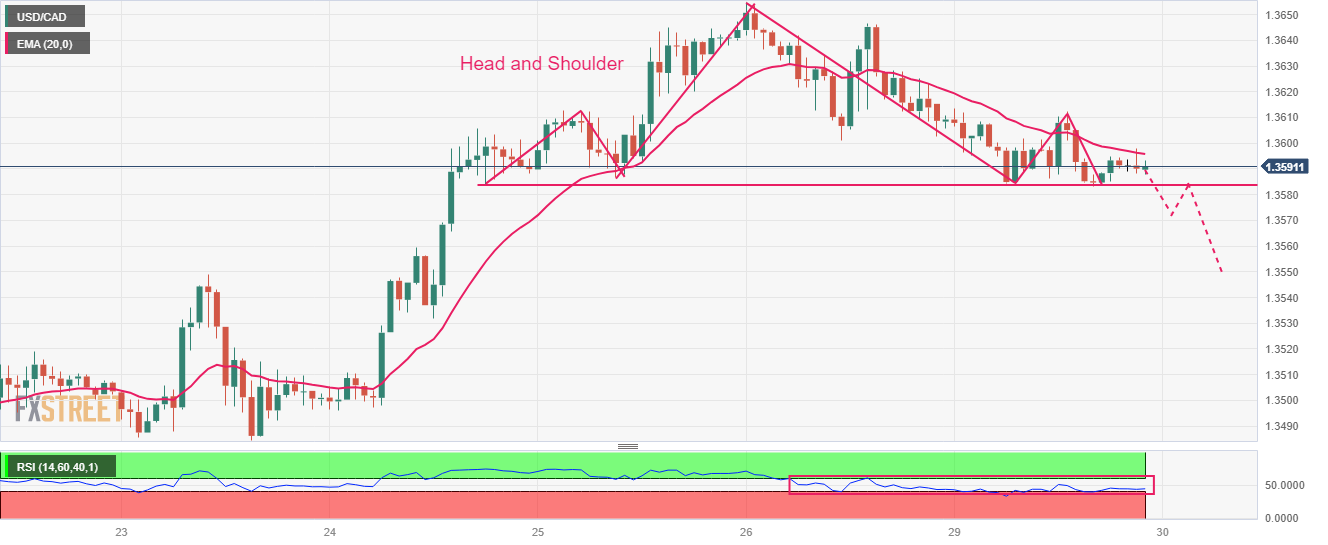- 美元/加元徘徊在头肩图形态位于1.3584附近的颈缐附近。