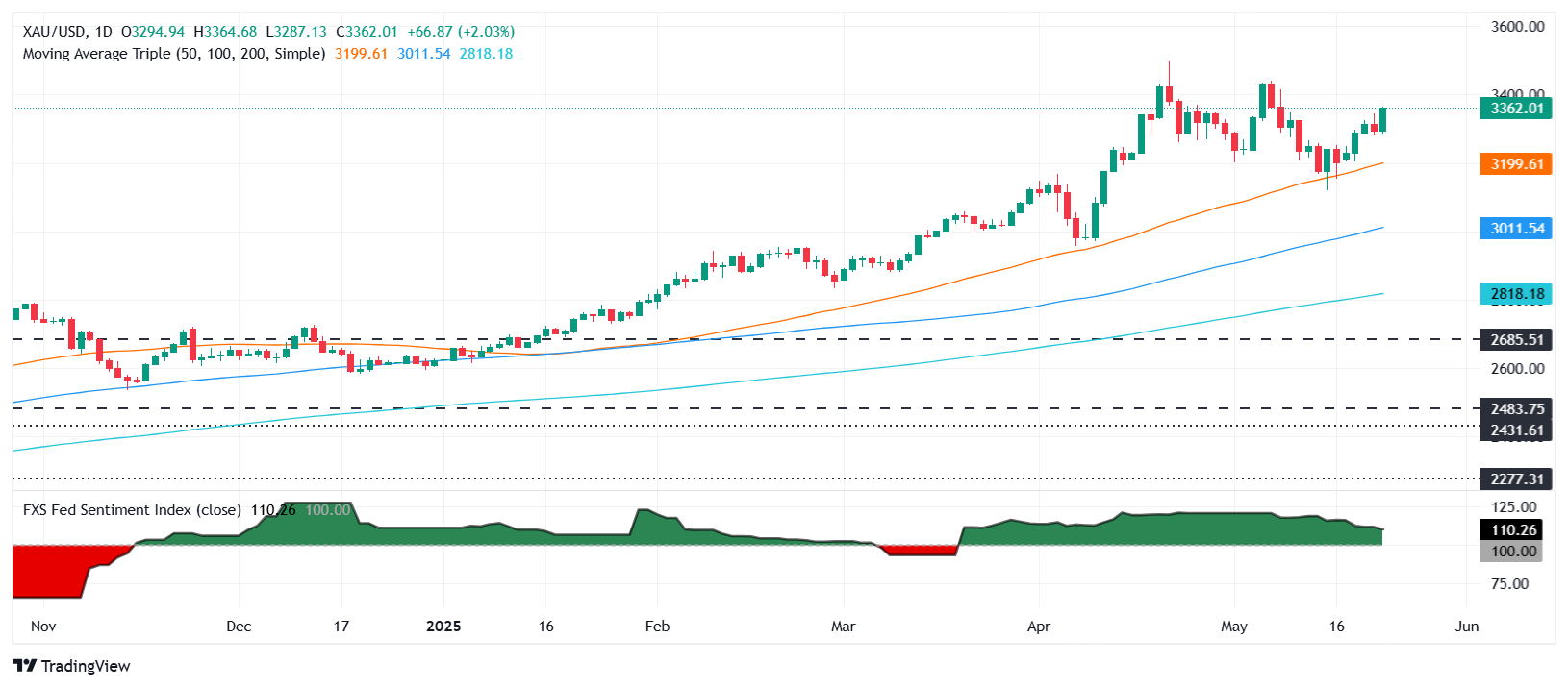 黄金价格延续涨势,准备在短期内测试3,400美元的关口。看涨动能依然强劲,相对强弱指数(RSI)向上,且在超𧹒之前有足够的空间。