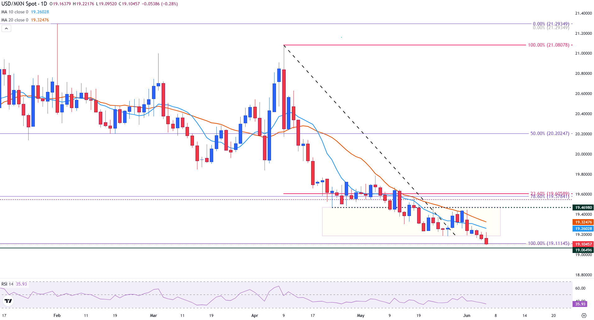 - 美元/墨西哥比索(USD/MXN)在19.20以下维持短期看跌趋势。