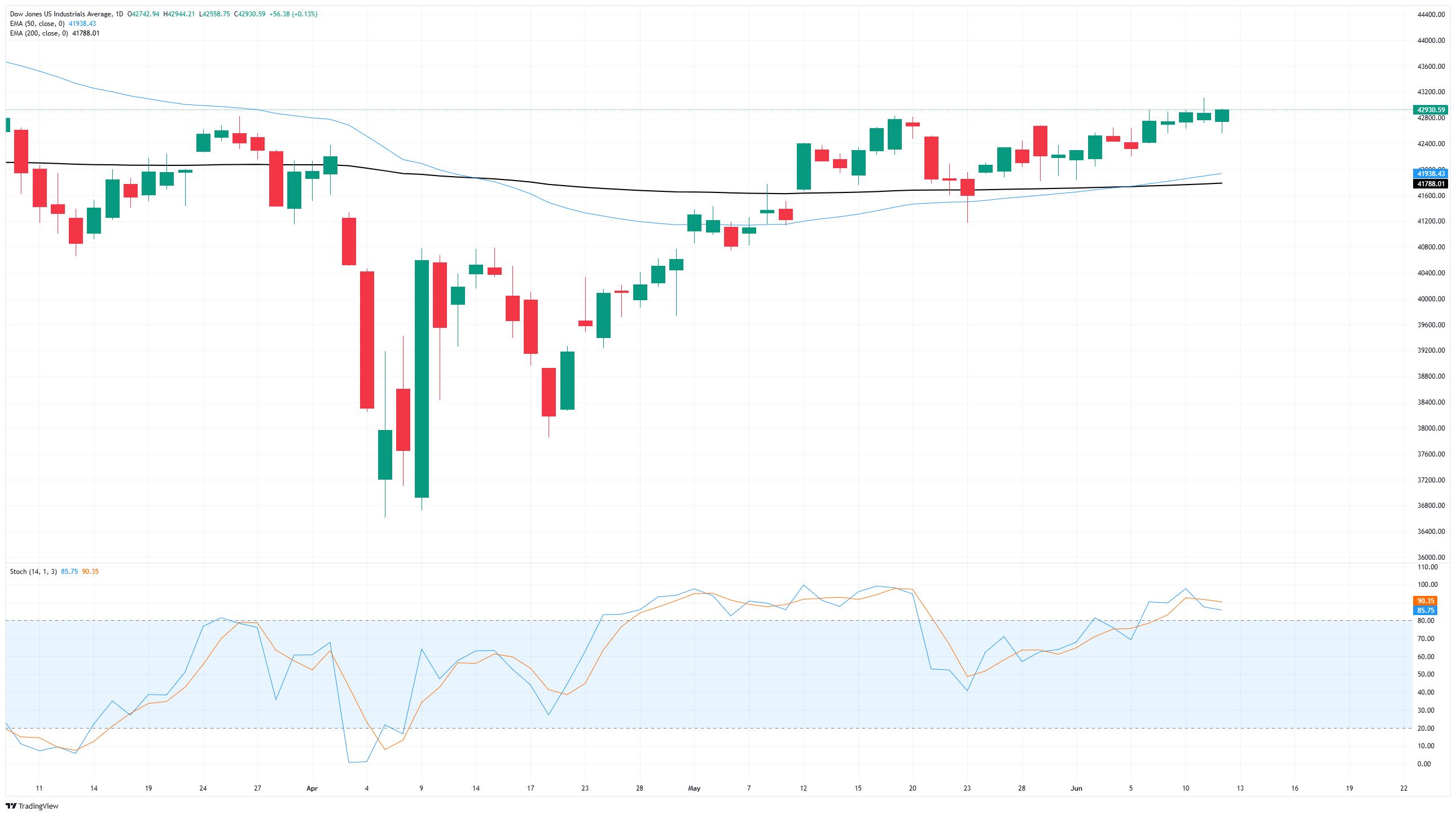 周四的看涨推动使道琼斯工业平均指数保持在43000这一主要价格关口的触及范围内,但有意义的动能仍然有限。价格走势继续陷入近期的拥堵区间,主要股指在努力拉𫔭𧹒盘与接近41780的200日指数移动平均缐(EMA)之间的距离。