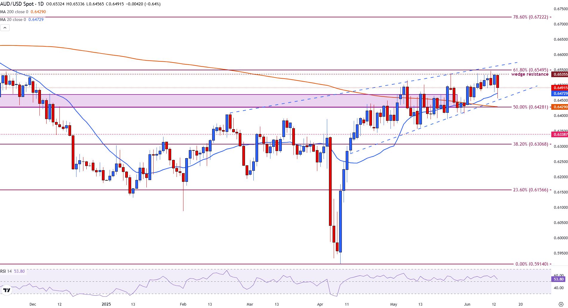 价格仍然被限制在一个上升楔形模式内,未能突破之前的楔形阻力,0.6535现在作為一个关键的上行障碍。
