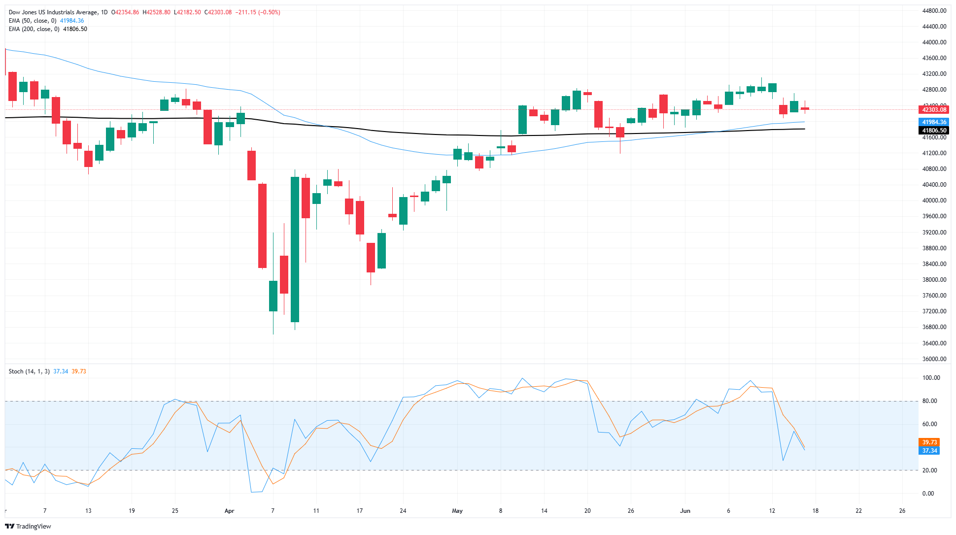 道琼斯工业平均指数(DJIA)在周二失去了一些地面,跌至42500以下,因為股市在日益加剧的以色列-伊朗冲突的压力下动盪不安。总统唐纳德·特朗普正迅速向直接参与冲突迈进,这一举动可能进一步动摇该地区的稳定。零售销售数据在5月份也大幅收缩,周二的数据发布显示美国零售购物量几乎下降了一个百分点。