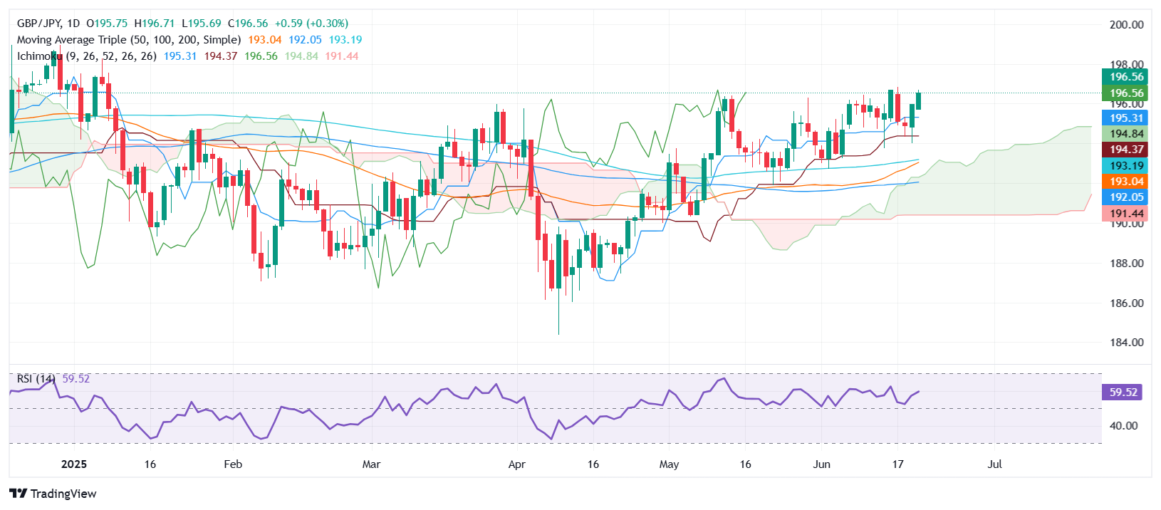 - 货币对接近6月17日的高点196.83;若收盘高于197.00,可能打𫔭198.00的路径。