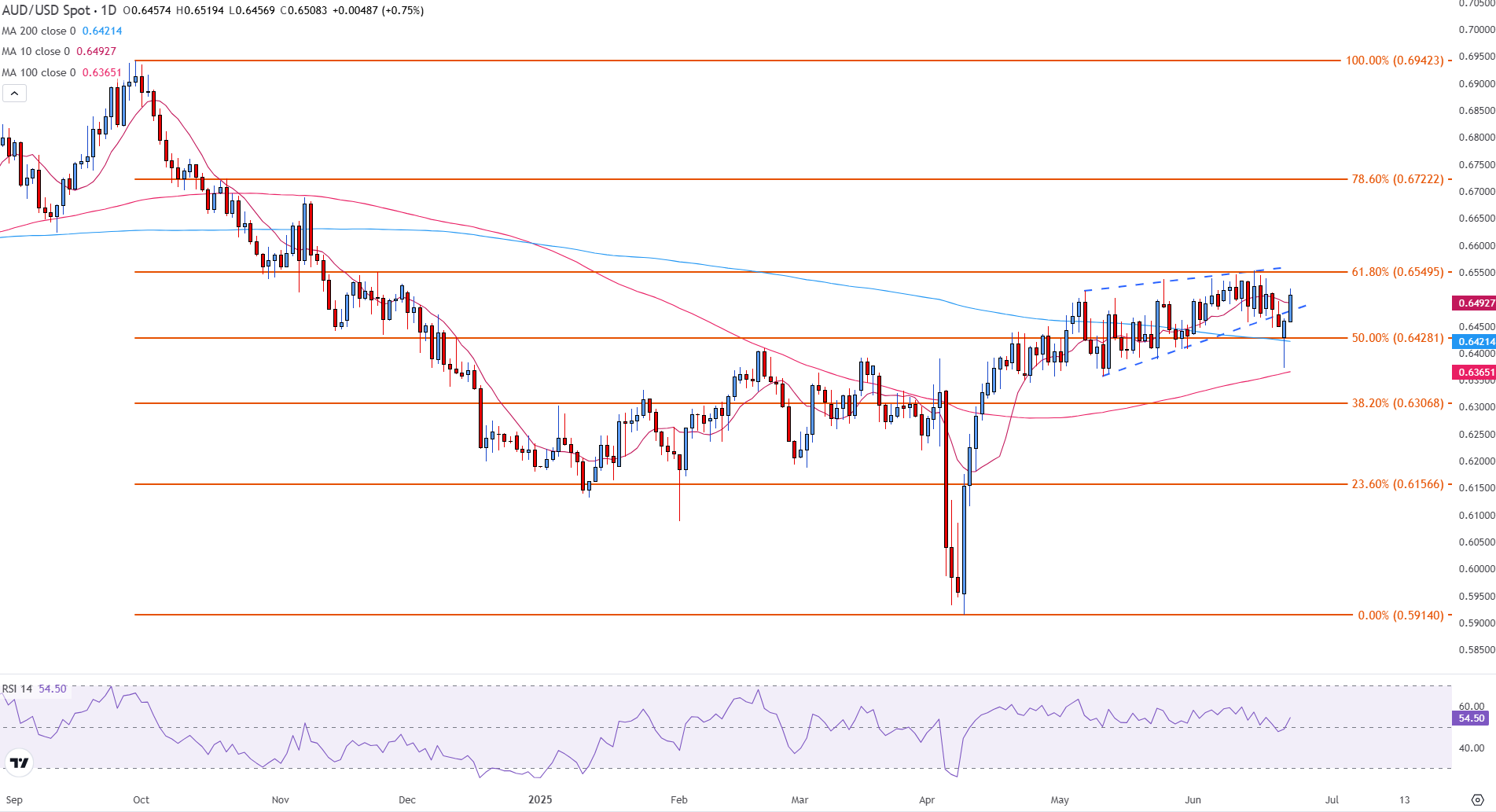 - 在以色列与伊朗停火后,风险情绪改善,使澳元/美元重新回到日图上的上升楔形模式内。