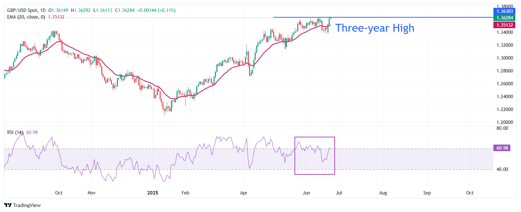 - 英镑兑美元在以色列-伊朗停火宣布后,在1.3650附近显示出强劲走势。