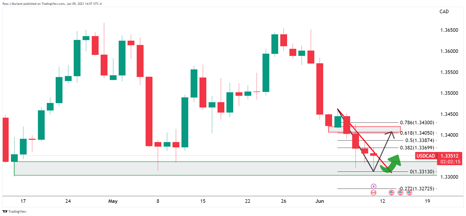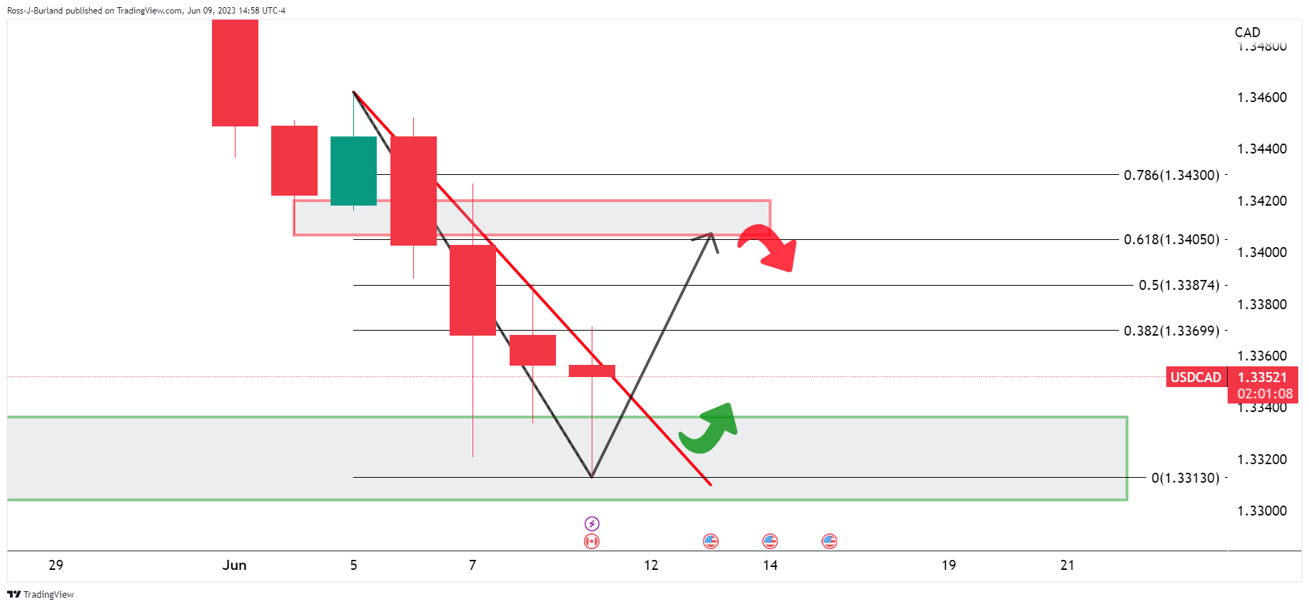 美元/加元当日走势坚挺,加大上涨幅。然而,周三,加拿大央行加息25个基点,达到22年来的高利率4.75%,原因是人们越来越担心通胀可能会维持在明显高于2%的目标。从以下分析来看,美元/加元将维持积累,这使得技术前景与基本面形成反差: