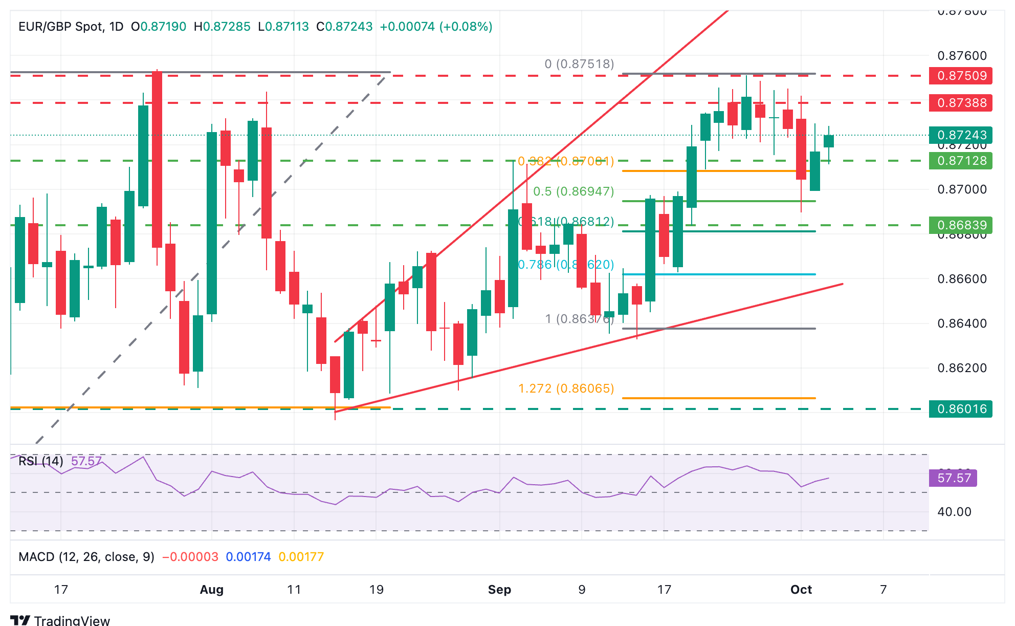 该货币对现在的目标是0.8740-0.8745的阻力区,该区域在9月30日和10月1日限制了多头。如果在此之上确认,将表明看跌修正结束,并将年初至今高点0.8750重新带回焦点。