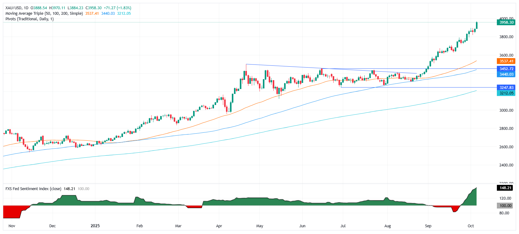 黄金价格在周一上涨至3900美元以上的新纪录高点,达到3970美元,因為美国政府继续停摆,而投资者预计美联储将在即将到来的10月29日会议上再次降息。XAU/USD在撰写时交易于3952美元,上涨1.73%。