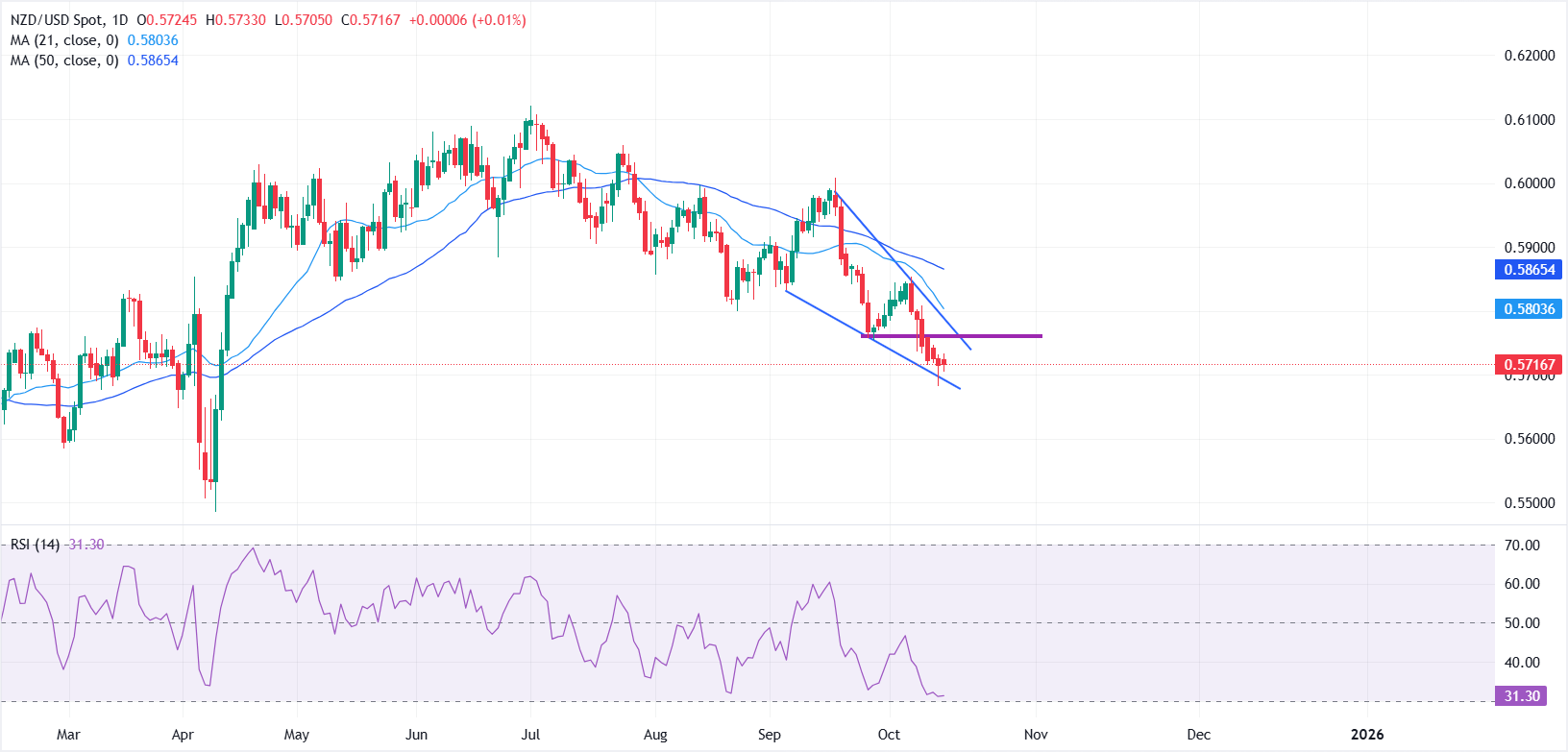在上行方面,初步阻力位在0.5750附近,这是一个曾经的支撑位,现在已转為阻力,与下行楔形的上边界相一致。若持续突破该区域,可能会暗示修正反弹的𫔭始,进一步的上行目标為21日简单移动均缐(SMA)在0.5800附近和50日SMA在0.5865附近。