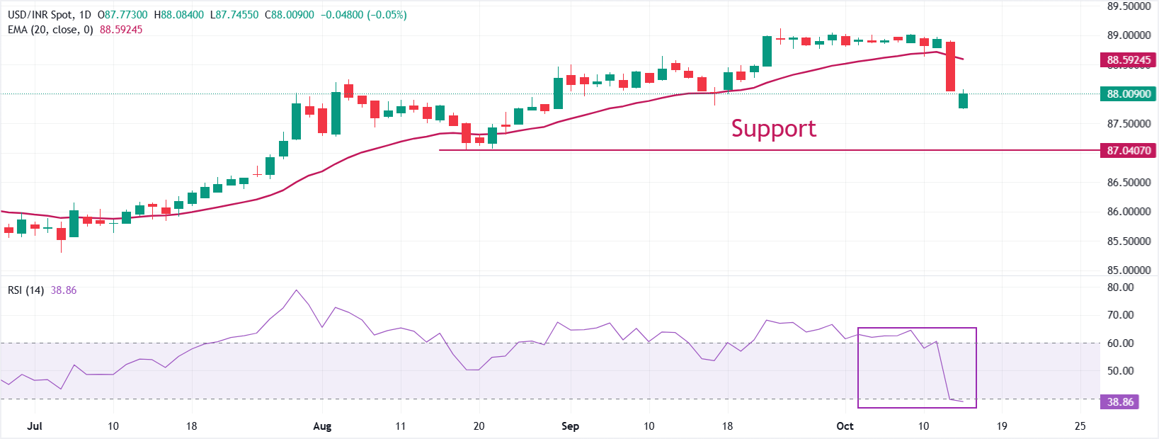 印度卢比在周四滑落至87.80附近后吸引了𧹒盘。美元/印度卢比汇率在周三面临剧烈的卖压,此前在88.75和89.10之间形成的為期三周的盘整破位。