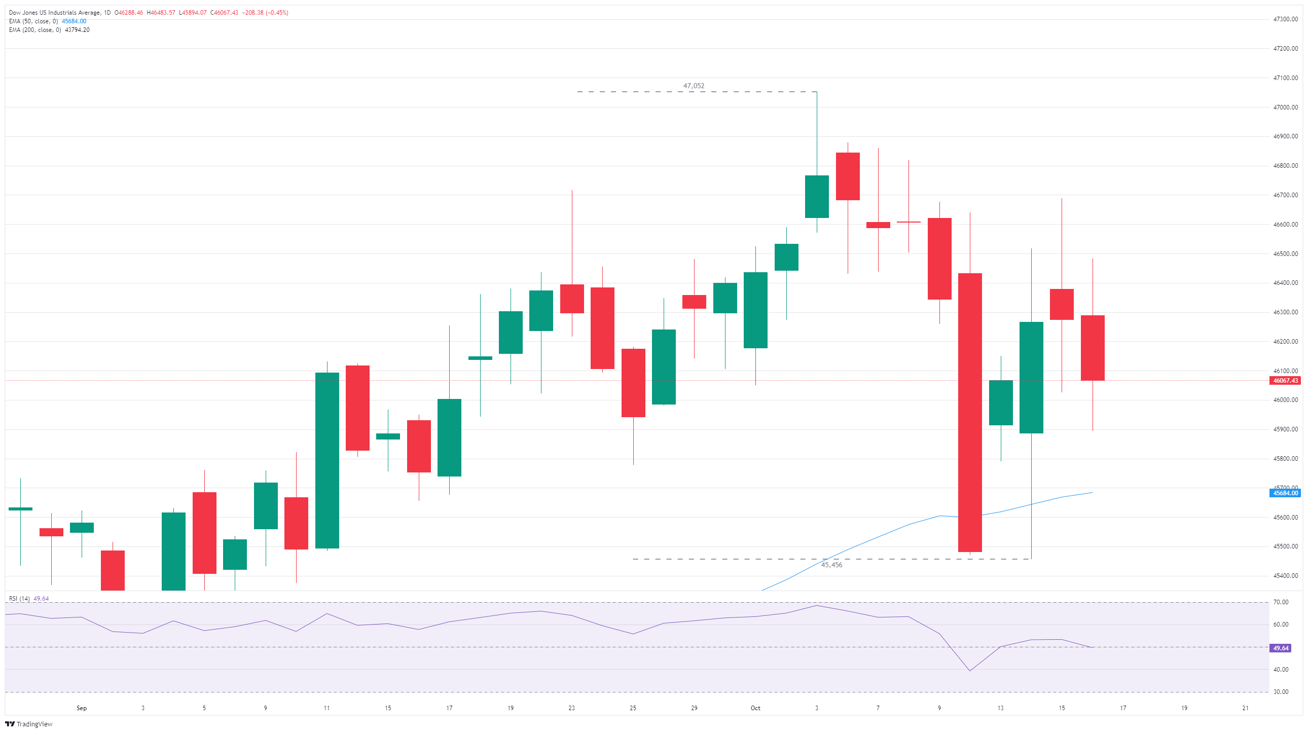 道琼斯工业平均指数(DJIA)在周四陷入加深的盘整区间,围绕46,200波动,全天下跌约300点。投资者仍然倾向于看涨,预计当前的政治和结构性问题最终会得到解决,但市场情绪持续受到冲击,裂痕不断加大。美国政府关门仍然是一个悬而未决的问题,投资者面临著风险厌恶情绪的再次袭来,因对银行资产负债表上风险贷款的担忧加剧。
