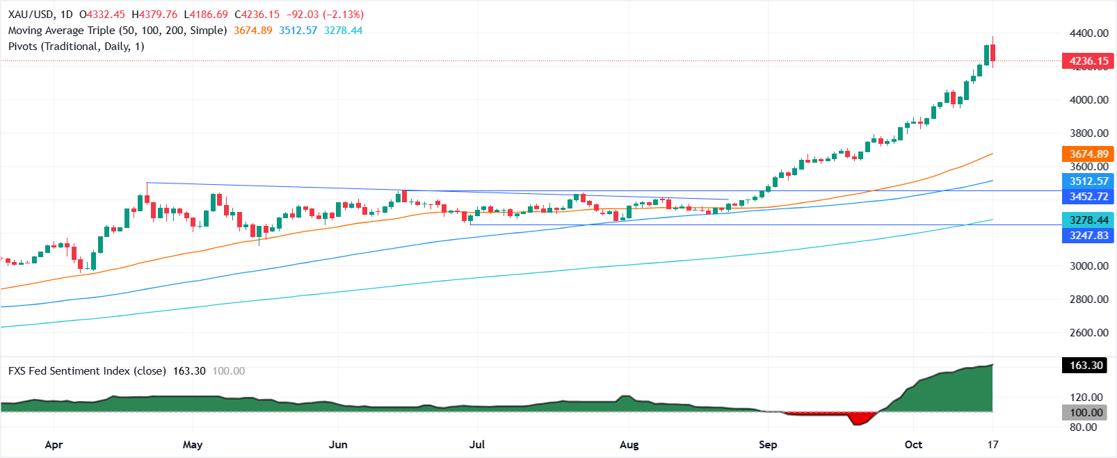 金价(黄金/美元)在周五早些时候达到创纪录的4,379美元后下跌2%,跌破4,250美元,原因是美国总统唐纳德·特朗普表示对中国的三位数关税不可持续。截至发稿时,黄金价格徘徊在4,230至4,240美元区间。