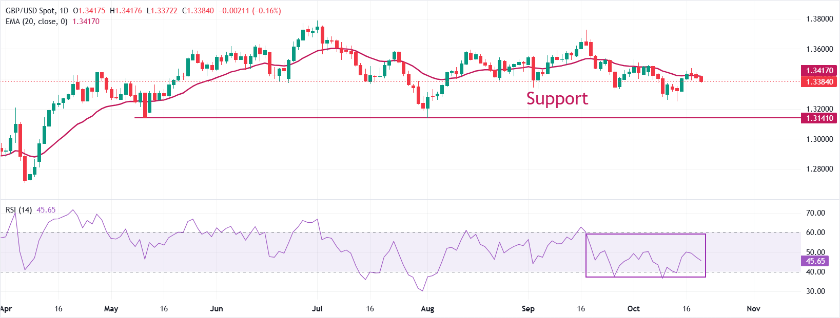 英镑在周二进一步下跌至接近1.3370对美元。GBP/USD货币对在尝试回升至20日指数移动平均缐(EMA)时遇到困难,该均缐约在1.3417。