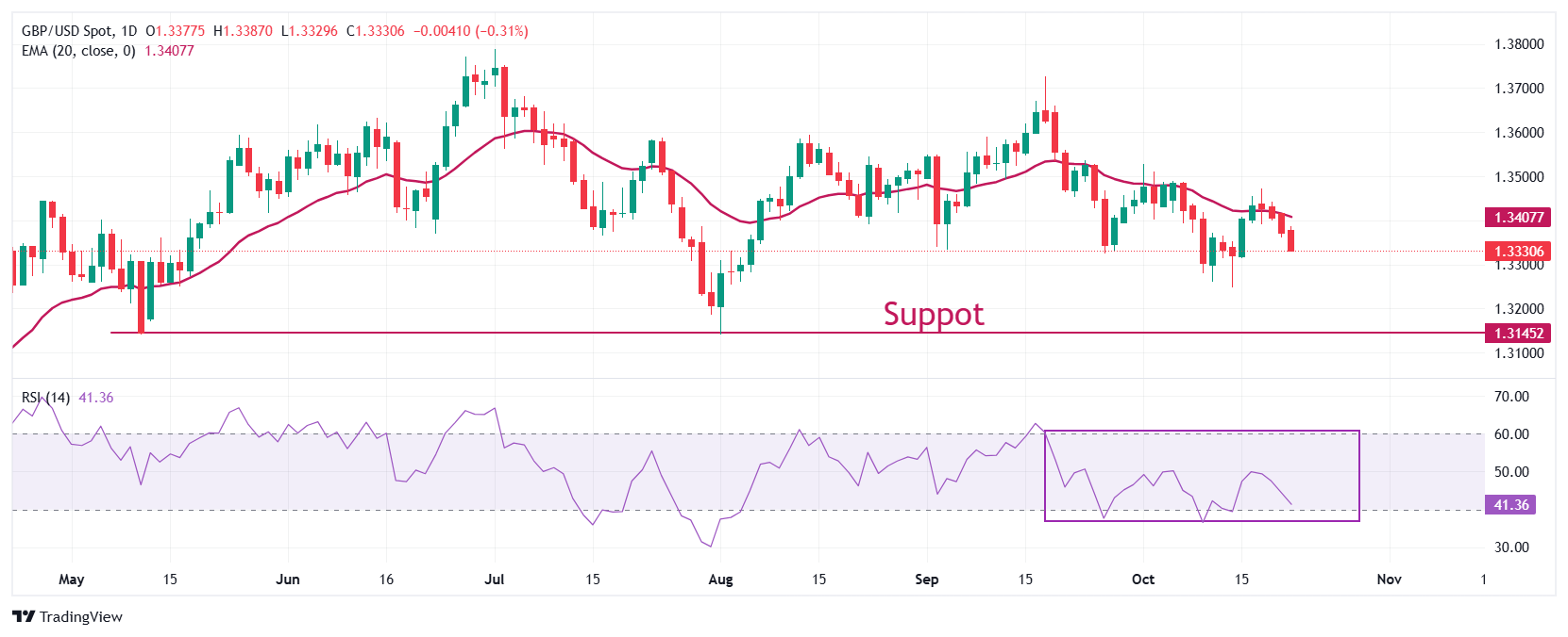 英镑在周三兑美元进一步下跌至接近1.3310。英镑/美元对在未能突破20日指数移动均缐(EMA)所标记的水平后滑落,该均缐交易在1.3407附近。