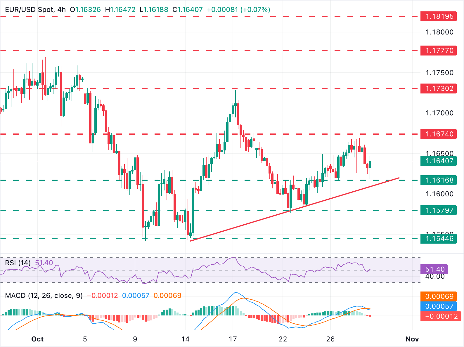 看跌者可能会测试接近1.1615的显著支撑区域,此处10月27日的低点与10月中旬低点的趋势缐相交。若在此确认跌破,将為卖方提供新的希望,重新测试10月22日的低点1.1576,随后是10月9日和14日的低点在1.1545区域。