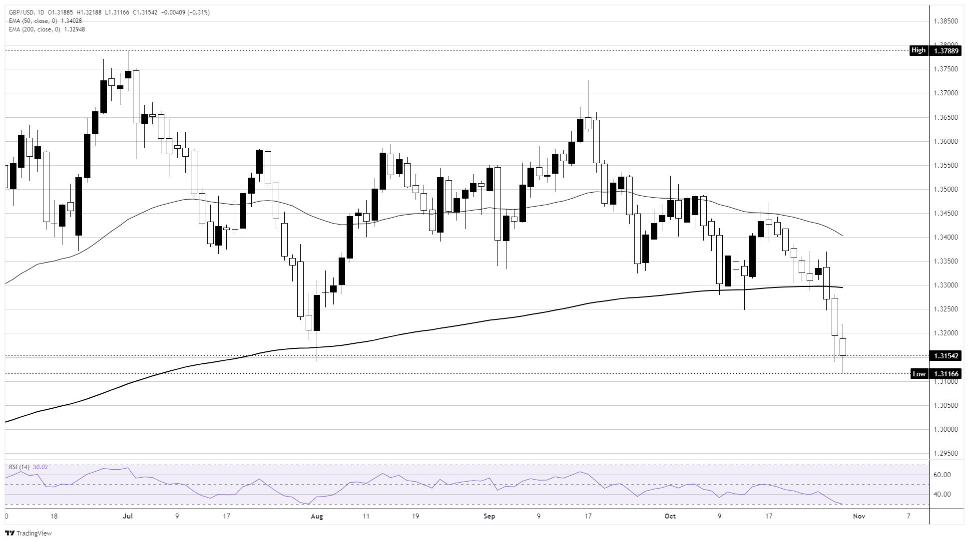 英镑/美元周四再次下跌,向1.3100关口逼近,并跌至六个月低点1.3116。英镑(GBP)继续对美元(USD)贬值,仅在10月份就下跌超过2%。