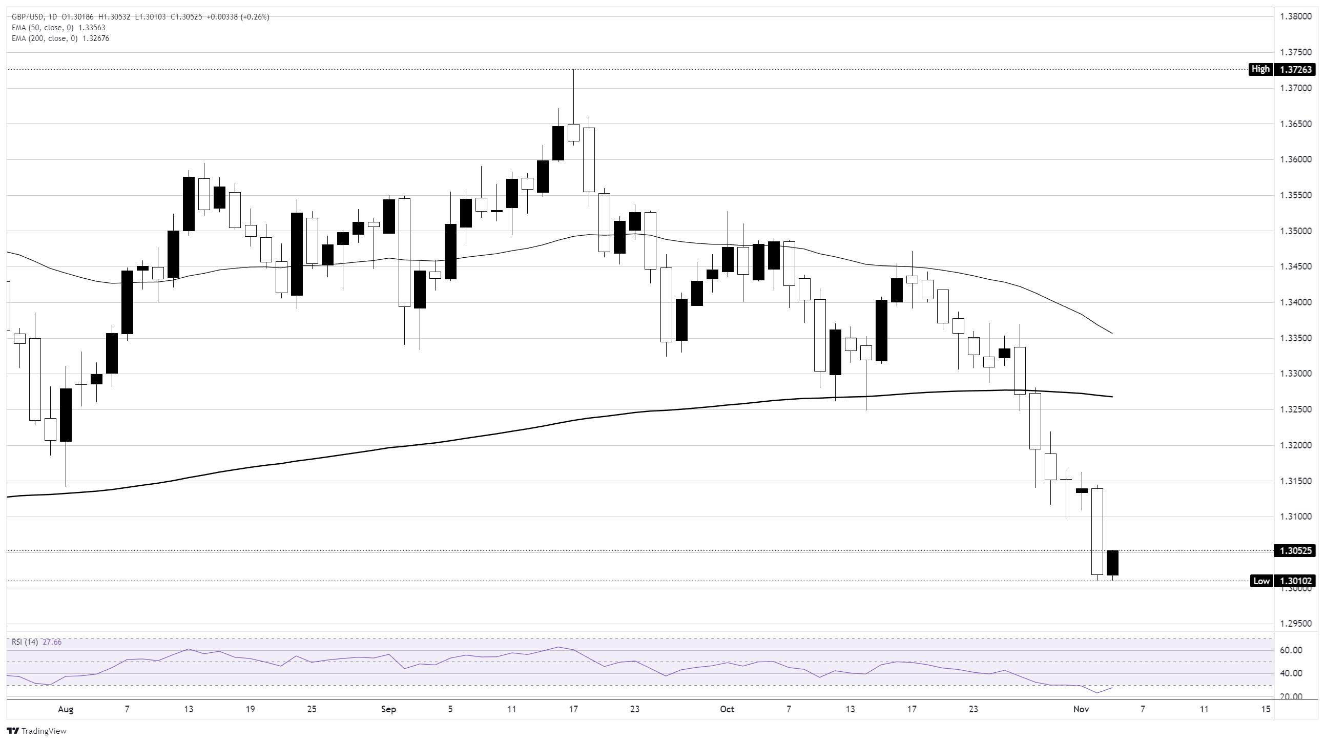 在周四的市场交易中,Cable货币对在1.3050附近挣扎。英镑/美元自10月中旬接近1.3470的最后一次高点以来下跌了超过3%,在过去13个连续交易日中仅有两天上涨。