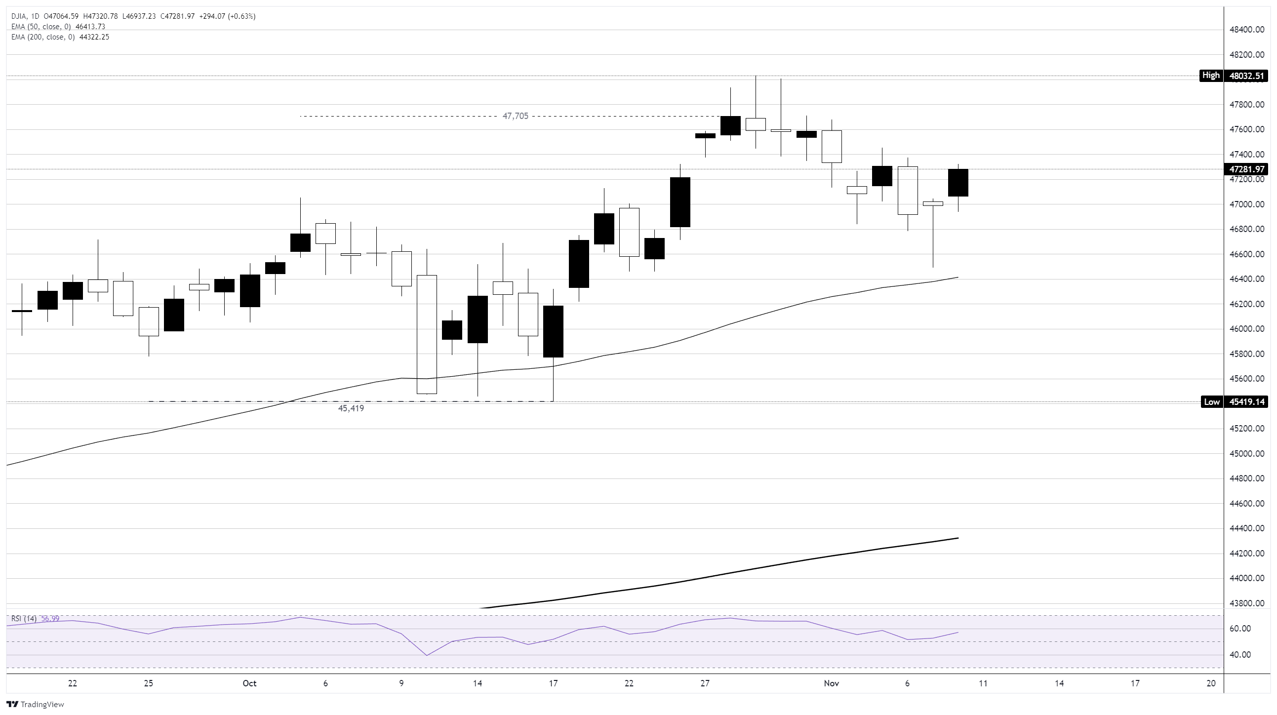 道琼斯工业平均指数(DJIA)在周一稳住了其支撑,𫔭啟新交易周,接近47,000的主要关口,上涨约300点。由于人工智慧科技股反弹出现回调迹象,或至少暂时喘口气,股市上周回落,投资者正在寻求结束美国历史上最长的政府资金停摆。