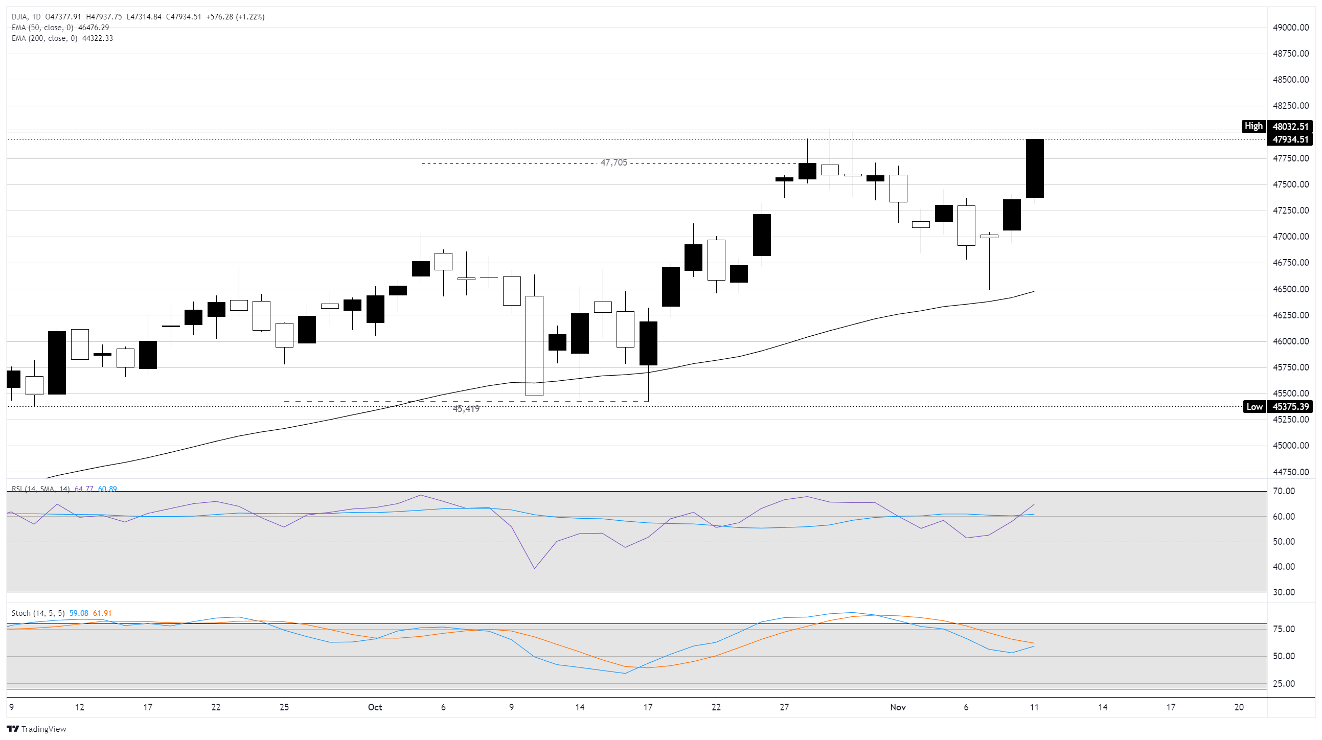 侭管其他主要股指普遍疲软,人工智慧科技反弹持续乏力,但道琼斯工业平均指数(DJIA)在周二找到了上涨的空间。道琼斯重新向48,000区域发起冲击,投资者寄希望于解决临时资助美国政府的问题,并恢复关键的劳动和通胀数据流。