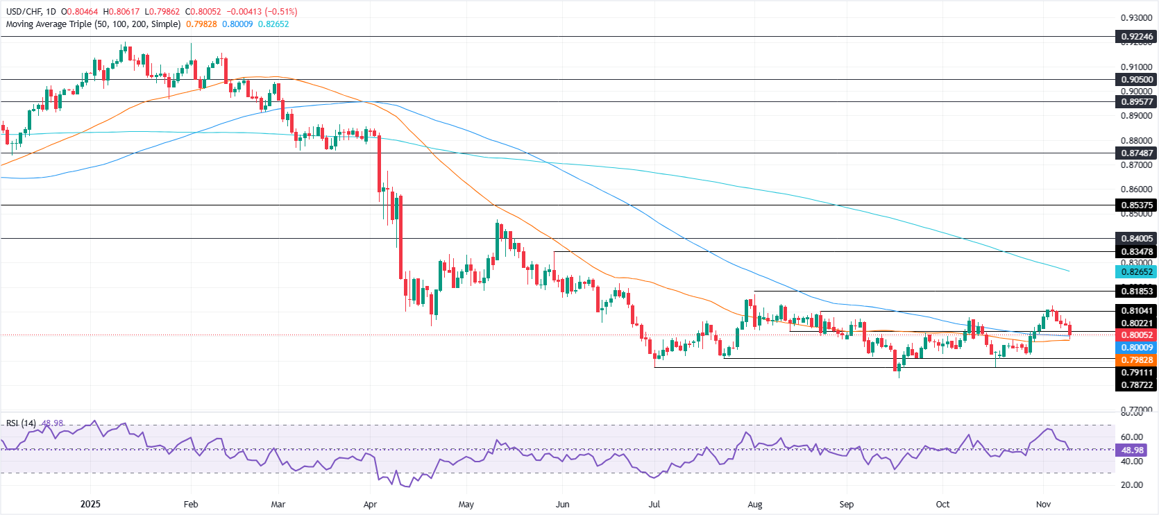 美元/瑞郎连续第四天下跌,交易价格约為0.8000,周二晚间在北美交易时段下跌0.55%。疲弱的美国经济数据和对瑞士的关税减免在交易时段内提振了瑞士法郎。