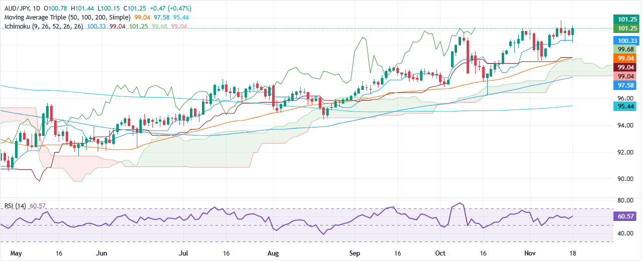 如果澳元/日元突破102.00,下一目标将是2024年11月7日的高点102.41,随后是103.00。相反,如果跌破101.50,首个支撑位将是101.00,随后是20日SMA和100.00。