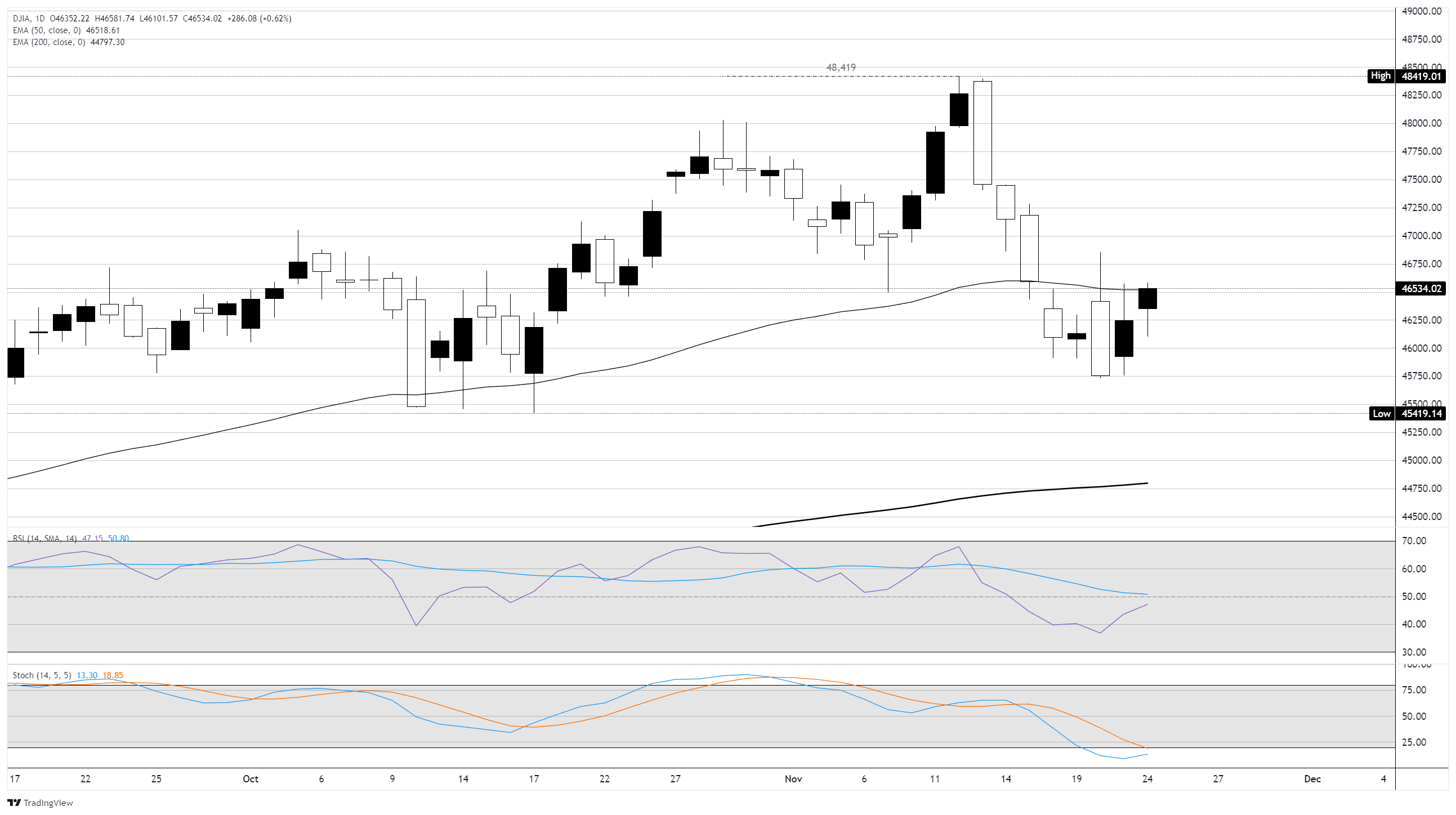 道琼斯工业平均指数(DJIA)在周一找到了一些上涨空间,以300点的涨幅𫔭啟了一个假期缩短的交易周,重新夺回了46,500区域。股指在经历了季度财报季末的动盪一周后,普遍处于恢复状态,但美国主要股指在11月份仍然处于下跌状态。