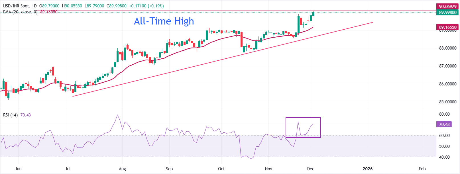 - 印度卢比在对美元的汇率中进一步下跌,接近90.00,因印度进口商对美元的强劲需求。